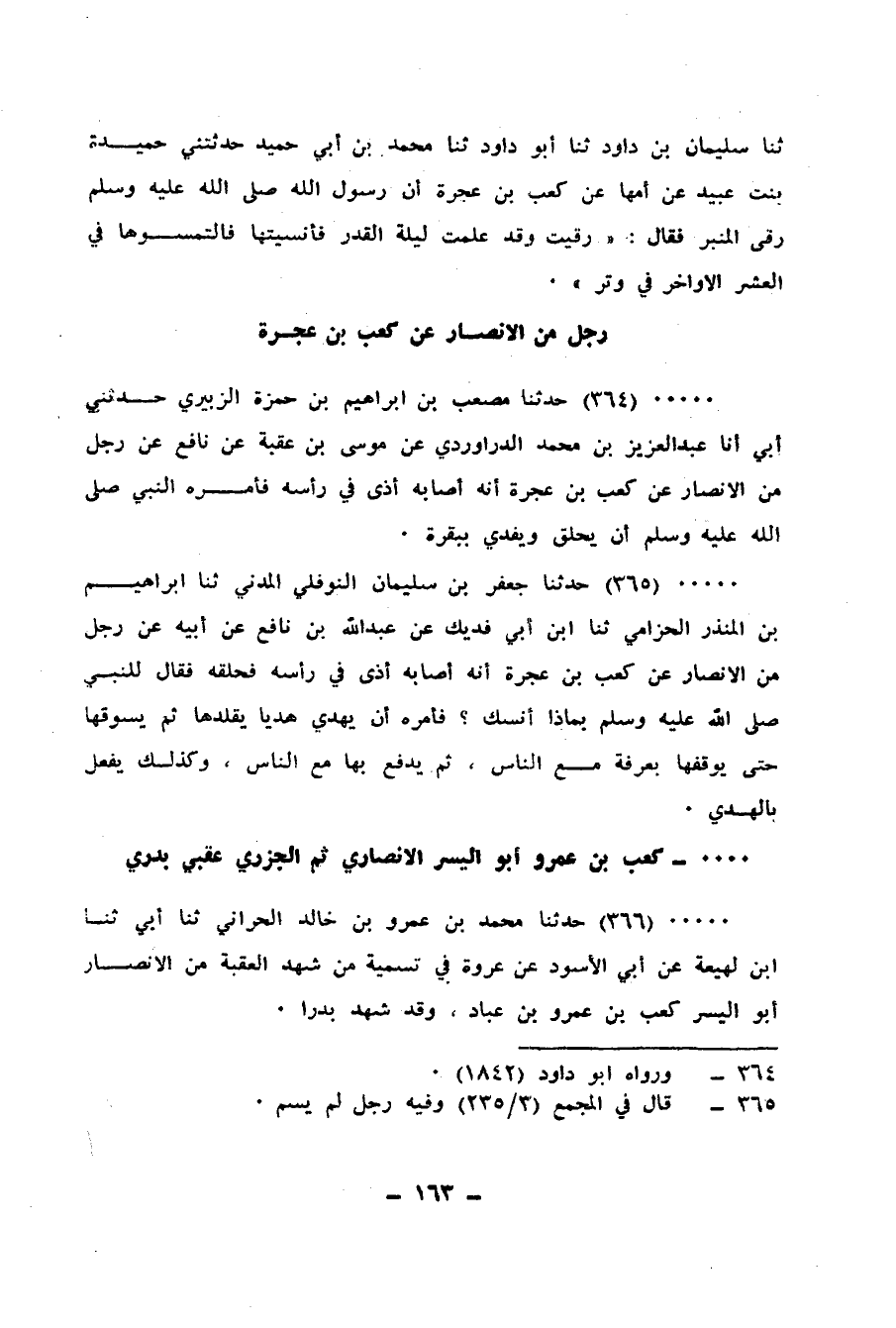 364 - حَدَّثَنَا مُصْعَبُ بْنُ إِبْرَاهِيمَ بْنِ حَمْزَةَ الزُّبَيْرِيُّ، حَدَّثَنِي أَبِي، أنا عَبْدُ الْعَزِيزِ بْنُ مُحَمَّدٍ الدَّرَاوَرْدِيُّ، عَنْ مُوسَى بْنِ عُقْبَةَ، عَنْ نَافِعٍ، عَنْ رَجُلٍ، مِنَ الْأَنْصَارِ عَنْ كَعْبِ بْنِ عُجْرَة: «أَنَّهُ §أَصَابَهُ أَذًى فِي رَأْسِهِ فَأَمَرَهُ النَّبِيُّ صَلَّى اللهُ عَلَيْهِ وَسَلَّمَ أَنْ يَحْلِقَ وَيَفْدِيَ بِبَقَرَةٍ»