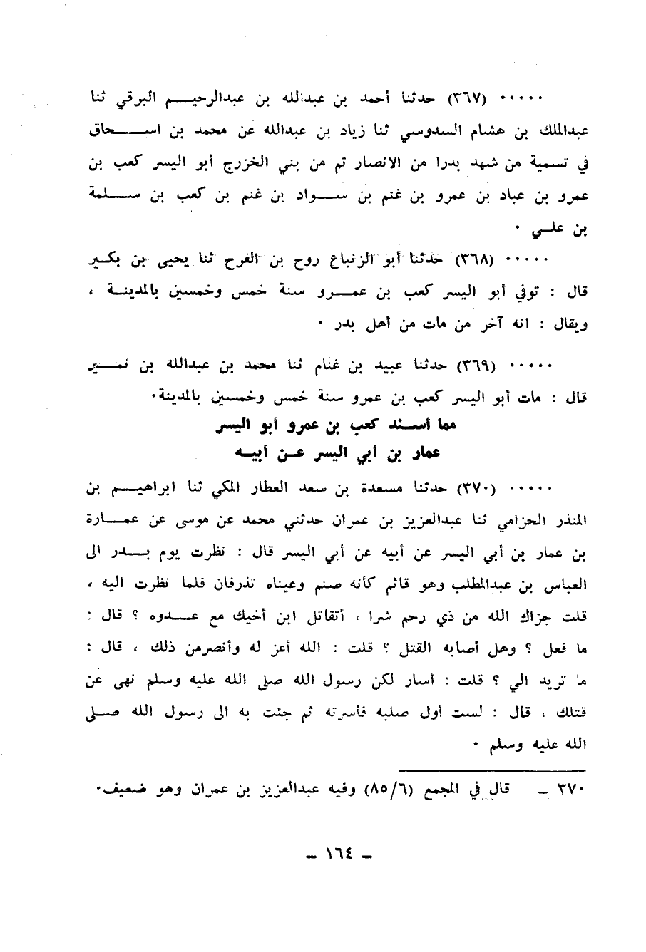 370 - حَدَّثَنَا مَسْعَدَةُ بْنُ سَعْدٍ الْعَطَّارُ الْمَكِّيُّ، ثنا إِبْرَاهِيمُ بْنُ الْمُنْذِرِ الْحِزَامِيُّ، ثنا عَبْدُ الْعَزِيزِ بْنُ عِمْرَانَ، حَدَّثَنِي مُحَمَّدٌ، عَنْ مُوسَى، عَنْ عُمَارَةَ بْنِ عَمَّارِ بْنِ أَبِي الْيَسَرِ، عَنْ أبِيهِ، عَنْ أبِي الْيَسَرِ، قَالَ: §نَظَرْتُ يَوْمَ بَدْرٍ إِلَى الْعَبَّاسِ بْنِ عَبْدِ الْمُطَّلِبِ وَهُوَ قَائِمٌ كَأَنَّهُ صَنَمٌ وَعَيْنَاهُ تَذْرِفَانِ، فَلَمَّا نَظَرْتُ إِلَيْهِ قُلْتُ: جَزَاكَ اللهُ مِنْ ذِي رَحِمٍ شَرًّا، أَتُقَاتِلُ ابْنَ أَخِيكَ مَعَ عَدُوِّهِ؟، قَالَ: مَا فَعَلَ وَهَلْ أَصَابَهُ الْقَتْلُ؟، قُلْتُ: اللهُ أَعَزُّ لَهُ وَأَنْصَرُ مِنْ ذَلِكَ، قَالَ: مَا تُرِيدُ إِلَيَّ؟، قُلْتُ: إِسَارٌ، لَكِنَّ رَسُولَ اللهِ صَلَّى اللهُ عَلَيْهِ وَسَلَّمَ نَهَى عَنْ قَتَلِكَ، قَالَ: لَسْتُ أَوَّلَ صِلَبهِ، فَأَسَرْتُهُ ثُمَّ جِئْتُ بِهِ إِلَى رَسُولِ اللهِ صَلَّى اللهُ عَلَيْهِ وَسَلَّمَ