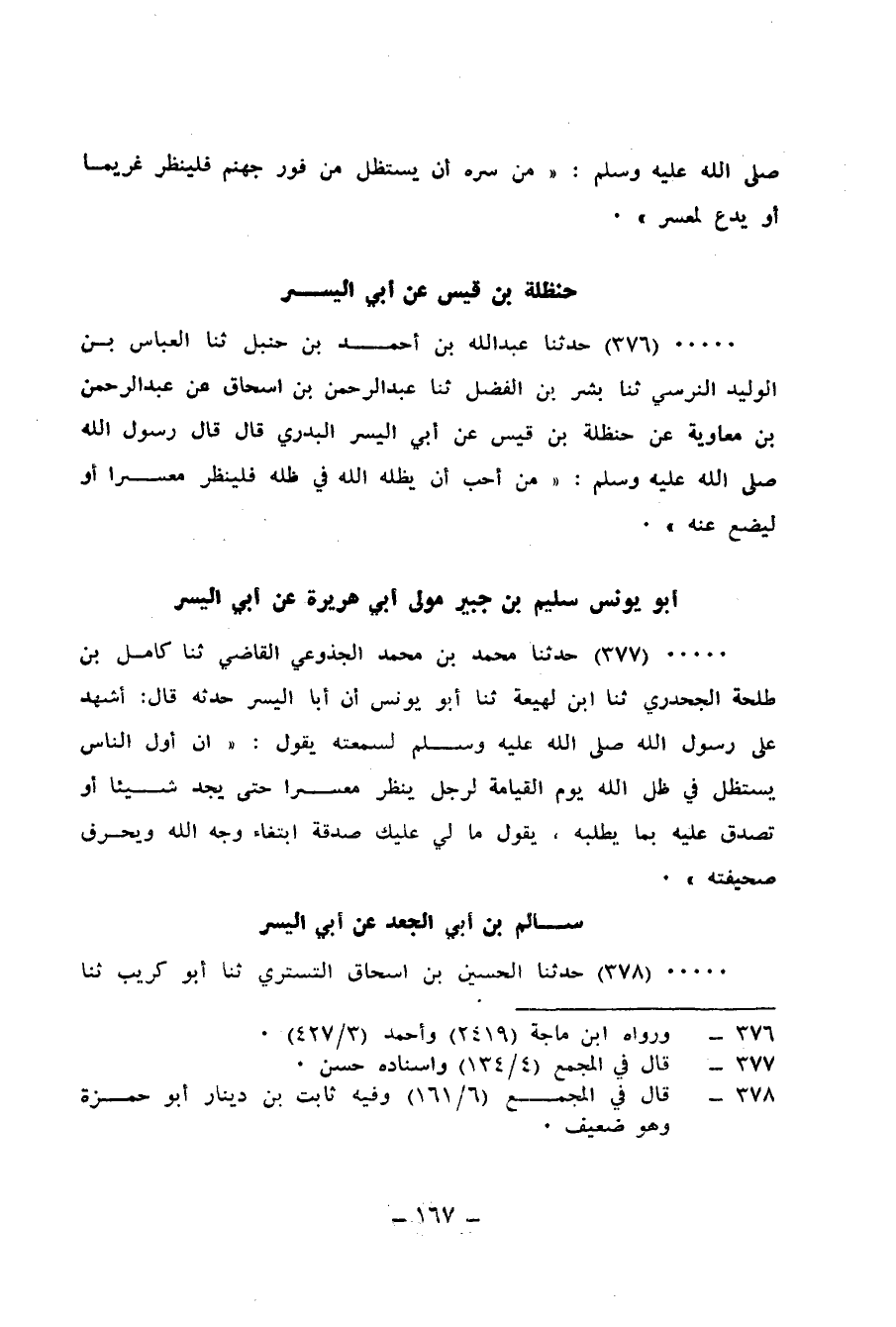376 - حَدَّثَنَا عَبْدُ اللهِ بْنُ أَحْمَدَ بْنِ حَنْبَلٍ، ثنا الْعَبَّاسُ بْنُ الْوَلِيدِ النَّرْسِيُّ، ثنا بِشْرُ بْنُ الْفَضْلِ، ثنا عَبْدُ الرَّحْمَنِ بْنُ إِسْحَاقَ، عَنْ عَبْدِ الرَّحْمَنِ بْنِ مُعَاوِيَةَ، عَنْ حَنْظَلَةَ بْنِ قَيْسٍ، عَنْ أبِي الْيَسَرِ الْبَدْرِيِّ، قَالَ: قَالَ رَسُولُ اللهِ صَلَّى اللهُ عَلَيْهِ وَسَلَّمَ: «§مَنْ أَحَبَّ أَنْ يُظِلَّهُ اللهُ فِي ظِلِّهِ فَلْيَنْظُرْ مُعْسِرًا أَوْ لَيَضَعْ عَنْهُ»