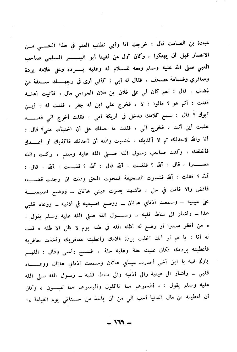 قُلْتُ لَهُ أَنَا: يَا عَمُّ لَوْ أَنَّكَ أَخَذْتَ بُرْدَةَ غُلَامِكَ وَأَعْطَيْتَهُ مَعَافِرِيَّكَ وَأَخَذْتَ مَعَافِرِيَّهُ فَأَعْطَيْتَهُ بُرْدَتَكَ، فَكَانَ عَلَيْكَ حُلَّةٌ وَعَلَيْهِ حُلَّةٌ، فَمَسَحَ رَأْسِي وَقَالَ: اللهُمَّ بَارِكْ فِيهِ، يَا ابْنَ أَخِي أَبْصَرَتْ عَيْنَايَ هَاتَانِ، وَسَمِعَتْ أُذُنَايَ هَاتَانِ وَوَعَاهُ قَلْبِي، وَأَشَارَ إِلَى عَيْنَيْهِ وَإِلَى أُذُنَيْهِ وَإِلَى مَنَاطِ قَلْبِهِ، رَسُولَ اللهِ صَلَّى اللهُ عَلَيْهِ وَسَلَّمَ يَقُولُ: «§أَطْعِمُوهُمْ مِمَّا تَأْكُلُونَ وَأَلْبِسُوهُمْ مِمَّا تَلْبَسُونَ» ، وَكَانَ أَنْ أَعْطَيْتُهُ مِنْ مَالِ الدُّنْيَا أَحَبَّ إِلَيَّ مِنْ أَنْ يَأْخُذَ مِنْ حَسَنَاتِي يَوْمَ الْقِيَامَةِ