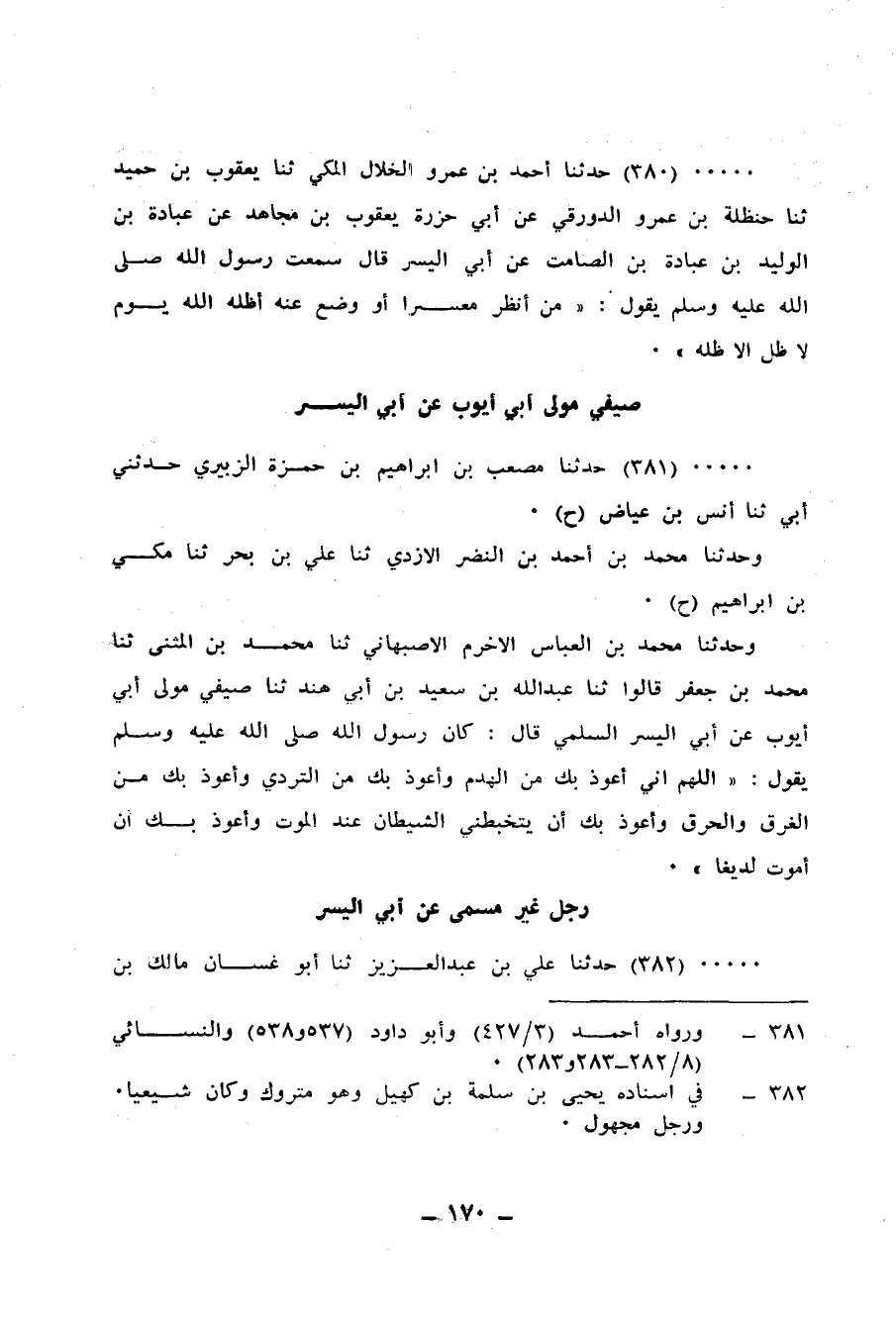 381 - حَدَّثَنَا مُصْعَبُ بْنُ إِبْرَاهِيمَ بْنِ حَمْزَةَ الزُّبَيْرِيُّ، حَدَّثَنِي أَبِي، ثنا أَنَسُ بْنُ عِيَاضٍ، ح وَحَدَّثَنَا مُحَمَّدُ بْنُ أَحْمَدَ بْنِ النَّضْرِ الْأَزْدِيُّ، ثنا عَلِيُّ بْنُ بَحْرٍ، ثنا مَكِّيُّ بْنُ إِبْرَاهِيمَ، ح وَحَدَّثَنَا مُحَمَّدُ بْنُ الْعَبَّاسِ الْأَخْرَمُ الْأَصْبَهَانِيُّ، ثنا مُحَمَّدُ بْنُ الْمُثَنَّى، ثنا مُحَمَّدُ بْنُ جَعْفَرٍ، قَالُوا: ثنا عَبْدُ اللهِ بْنُ سَعِيدِ بْنِ أَبِي هِنْدَ، ثنا صَيْفِيُّ، مَوْلَى أَبِي أَيُّوبَ، عَنْ أبِي الْيَسَرِ السُّلَمِيِّ، قَالَ: كَانَ رَسُولُ اللهِ صَلَّى اللهُ عَلَيْهِ وَسَلَّمَ يَقُولُ: «§اللهُمَّ إِنِّي أَعُوذُ بِكَ مِنَ الْهَدْمِ، وَأَعُوذُ بِكَ مِنَ التَّرَدِّي، وَأَعُوذُ بِكَ مِنَ الْغَرَقِ وَالْحَرَقِ، وَأَعُوذُ بِكَ أَنْ يَتَخَبَّطَنِي الشَّيْطَانُ عِنْدَ الْمَوْتِ، وَأَعُوذُ بِكَ أَنْ أَمُوتَ لَدِيغًا»