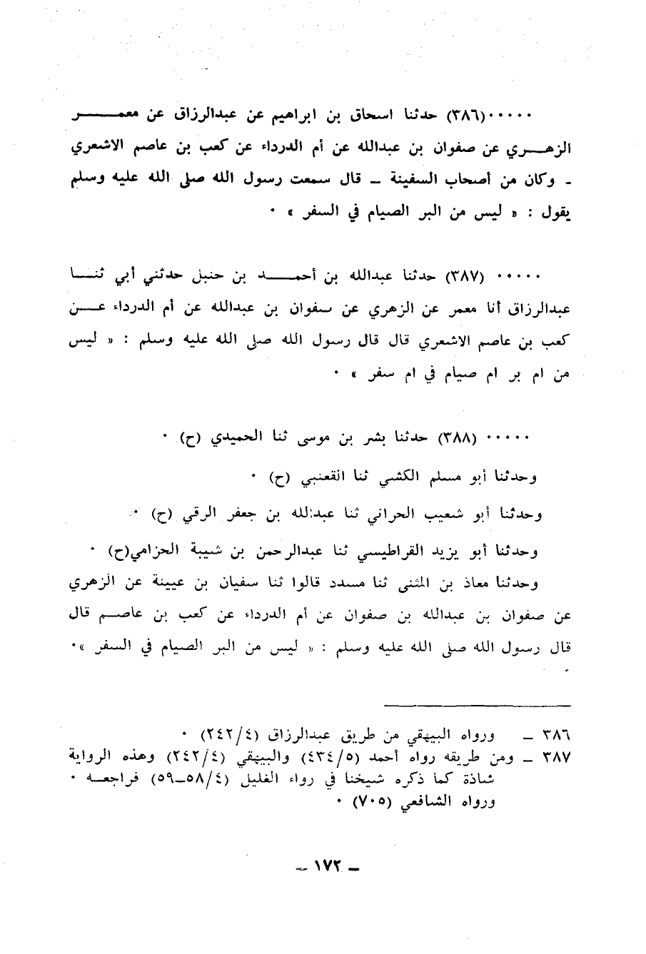 387 - حَدَّثَنَا عَبْدُ اللهِ بْنُ أَحْمَدَ بْنِ حَنْبَلٍ، حَدَّثَنِي أَبِي، ثنا عَبْدُ الرَّزَّاقِ، أنا مَعْمَرٌ، عَنِ الزُّهْرِيِّ، عَنْ صَفْوَانَ بْنِ عَبْدِ اللهِ، عَنْ أُمِّ الدَّرْدَاءِ، عَنْ كَعْبِ بْنِ عَاصِمٍ الْأَشْعَرِيِّ، قَالَ: قَالَ رَسُولُ اللهِ صَلَّى اللهُ عَلَيْهِ وَسَلَّمَ: «§لَيْسَ مِنْ أُمِّ بِرٍّ أُمُّ صِيَامٍ فِي أُمِّ سَّفَرٍ»