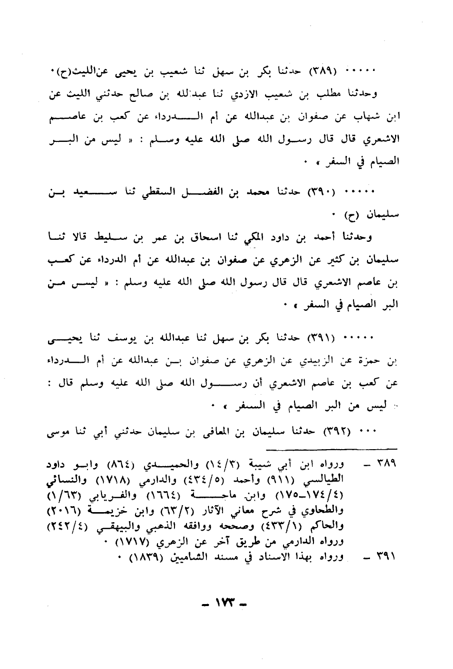 391 - حَدَّثَنَا بَكْرُ بْنُ سَهْلٍ، ثنا عَبْدُ اللهِ بْنُ يُوسُفَ، ثنا يَحْيَى بْنُ حَمْزَةَ، عَنِ الزُّبَيْدِيِّ، عَنِ الزُّهْرِيِّ، عَنْ صَفْوَانَ بْنِ عَبْدِ اللهِ، عَنْ أُمِّ الدَّرْدَاءِ، عَنْ كَعْبِ بْنِ عَاصِمٍ الْأَشْعَرِيِّ، أَنَّ رَسُولَ اللهِ صَلَّى اللهُ عَلَيْهِ وَسَلَّمَ قَالَ: «§لَيْسَ مِنَ الْبِرِّ الصِّيَامُ فِي السَّفَرِ»