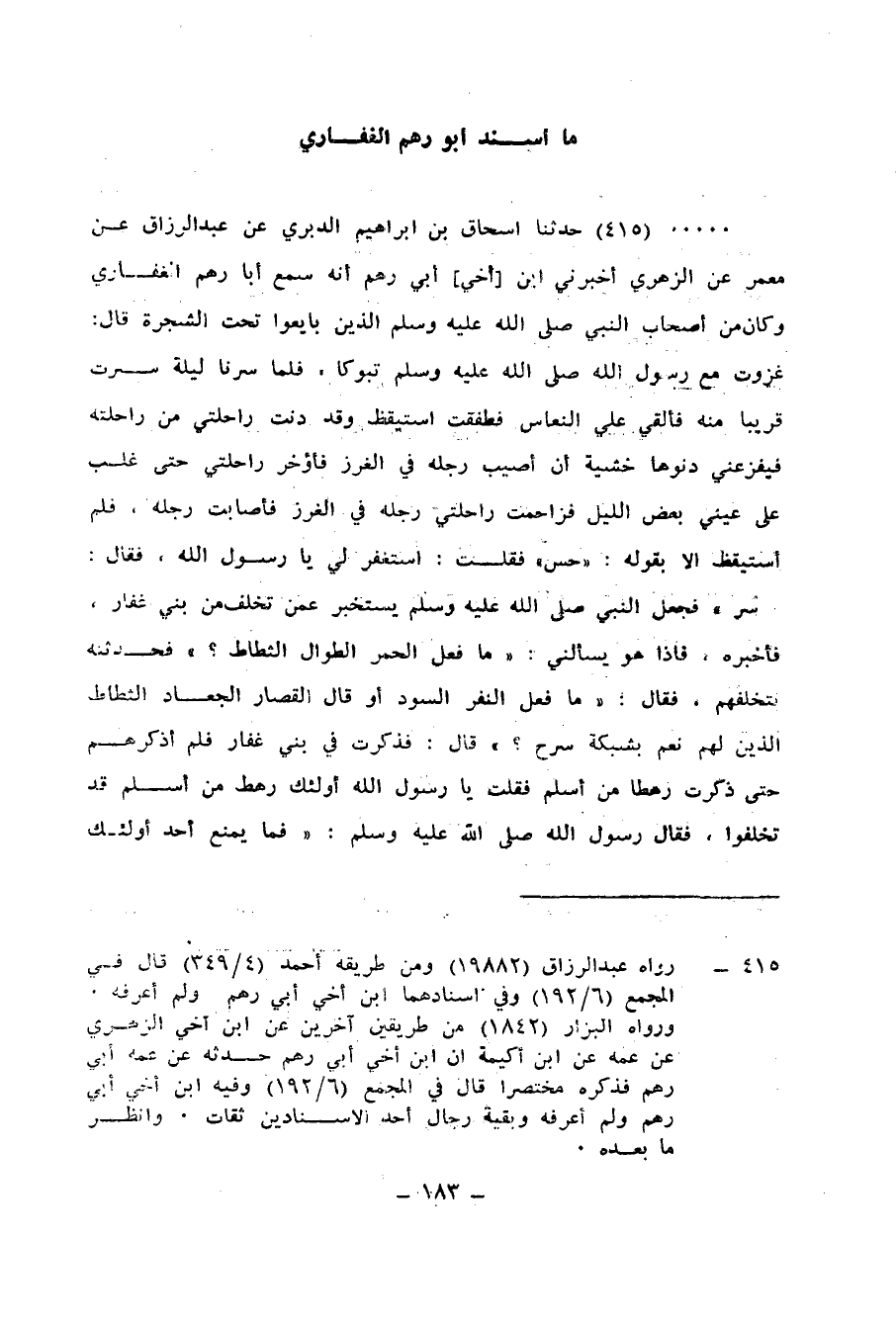 415 - حَدَّثَنَا إِسْحَاقُ بْنُ إِبْرَاهِيمَ الدَّبَرِيُّ، عَنْ عَبْدِ الرَّزَّاقِ، عَنْ مَعْمَرٍ، عَنِ الزُّهْرِيِّ، أَخْبَرَنِي ابْنُ أَخِي أَبِي رُهْمٍ، أَنَّهُ سَمِعَ أَبَا رُهْمٍ الْغِفَارِيَّ، وَكَانَ مِنْ أَصْحَابِ النَّبِيِّ صَلَّى اللهُ عَلَيْهِ وَسَلَّمَ الَّذِينَ بَايَعُوا تَحْتَ الشَّجَرَةِ، قَالَ: §غَزَوْتُ مَعَ رَسُولِ اللهِ صَلَّى اللهُ عَلَيْهِ وَسَلَّمَ تَبُوكًا، فَلَمَّا سِرْنَا لَيْلَةً سِرْتُ قَرِيبًا مِنْهُ فَأُلْقِيَ عَلِيَّ النُّعَاسُ، فَطَفِقْتُ أَسْتَيْقِظُ وَقَدْ دَنَتْ رَاحِلَتِي مِنْ رَاحِلَتِهِ، فَيُفْزِعُنِي دُنُوُّهَا خَشْيَةَ أَنْ أُصِيبَ رِجْلَهُ فِي الْغَرْزِ، فَأُؤَخِّرُ رَاحِلَتِي، حَتَّى غَلَبَ عَلَى عَيْنِي بَعْضُ اللَّيْلِ فَزَاحَمَتْ رَاحِلَتِي رِجْلَهُ فِي الْغَرْزِ فَأَصَابَتْ رِجْلَهُ، فَلَمْ أَسْتَيْقِظْ إِلَّا بِقَوْلِهِ: «حَسِّ» ، فَقُلْتُ: اسْتَغْفِرْ لِي يَا رَسُولَ اللهِ، فَقَالَ: «سِرْ» ، فَطَفِقَ النَّبِيُّ صَلَّى اللهُ عَلَيْهِ وَسَلَّمَ يَسْتَخْبِرُنِي عَمَّنْ تَخَلَّفَ مِنْ بَنِي غِفَارٍ فَأُخْبِرُهُ، فَإِذَا هُوَ يَسْأَلُنِي: «مَا فَعَلَ الْحُمُرُ الطِّوَالُ الثَّطَاطُ؟» ، فَحَدَّثْتُهُ بِتَخَلُّفِهِمْ، فَقَالَ: «مَا فَعَلَ النَّفَرُ السُّودُ» ، أَوْ قَالَ: «الْقِصَارُ الْجِعَادُ الثَّطَاطُ الَّذِينَ لَهُمْ نِعَمٌ بِشَبَكَةٍ سُرُحٌ؟» ، قَالَ: فَذَكَرْتُ فِي بَنِي غِفَارٍ فَلَمْ أَذْكُرْهُمْ، حَتَّى ذَكَرْتُ رَهْطًا مِنْ أَسْلَمَ، فَقُلْتُ: يَا رَسُولَ اللهِ أُولَئِكَ رَهْطٌ مِنْ أَسْلَمَ قَدْ تَخَلَّفُوا، فَقَالَ رَسُولُ اللهِ صَلَّى اللهُ عَلَيْهِ وَسَلَّمَ: «فَمَا يَمْنَعُ أَحَدَ أُولَئِكَ حِينَ تَخَلَّفَ أَنْ يَحْمِلَ عَلَى بَعِيرٍ مِنْ إِبِلِهِ امْرَأً نَشِيطًا فِي سَبِيلِ اللهِ؟، فَإِنَّ أَعَزَّ أَهْلِي عَلِيَّ أَنْ يَتَخَلَّفَ عَنِّي الْمُهَاجِرُونَ، مِنْ قُرَيْشٍ، وَالْأَنْصَارُ، وَأَسْلَمُ، وَغِفَارٌ»