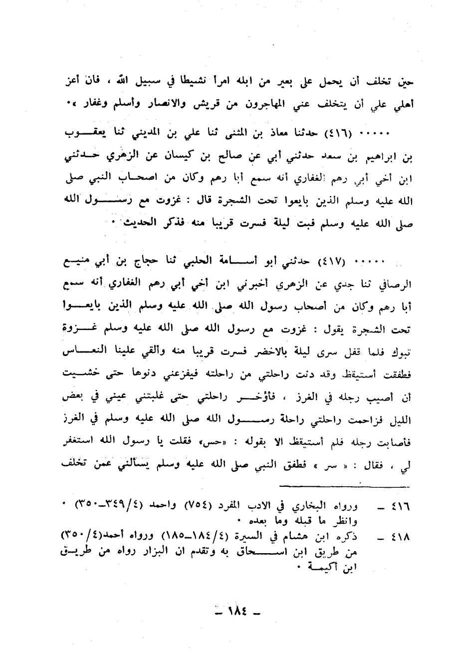416 - حَدَّثَنَا مُعَاذُ بْنُ الْمُثَنَّى، ثنا عَلِيُّ بْنُ الْمَدِينِيِّ، ثنا يَعْقُوبُ بْنُ إِبْرَاهِيمَ بْنِ سَعْدٍ، حَدَّثَنِي أَبِي، عَنْ صَالِحِ بْنِ كَيْسَانَ، عَنِ الزُّهْرِيِّ، حَدَّثَنِي ابْنُ أَخِي أَبِي رُهْمٍ الْغِفَارِيِّ، أَنَّهُ سَمِعَ أَبَا رُهْمٍ، وَكَانَ مِنْ أَصْحَابِ النَّبِيِّ صَلَّى اللهُ عَلَيْهِ وَسَلَّمَ الَّذِينَ بَايَعُوا تَحْتَ الشَّجَرَةِ، قَالَ: §غَزَوْتُ مَعَ رَسُولِ اللهِ صَلَّى اللهُ عَلَيْهِ وَسَلَّمَ فَبِتُّ لَيْلَةً فَسِرْتُ قَرِيبًا مِنْهُ "، فَذَكَرَ الْحَدِيثَ