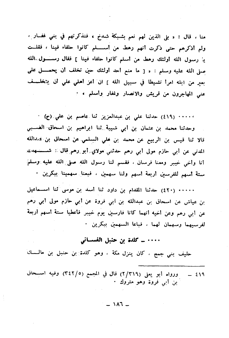 419 - حَدَّثَنَا عَلِيُّ بْنُ عَبْدِ الْعَزِيزِ، ثنا عَاصِمُ بْنُ عَلِيٍّ، ح وَحَدَّثَنَا مُحَمَّدُ بْنُ عُثْمَانَ بْنِ أَبِي شَيْبَةَ، ثنا إِبْرَاهِيمُ بْنُ إِسْحَاقَ الضَّبِّيُّ، قَالَا: ثنا قَيْسُ بْنُ الرَّبِيعِ، عَنْ مُحَمَّدِ بْنِ عَلِيٍّ السُّلَمِيُّ، عَنْ إِسْحَاقَ بْنِ عَبْدِ اللهِ الْمَدَنِيِّ، عَنْ أبِي حَازِمٍ، مَوْلَى أَبِي رُهْمٍ، حَدَّثَنِي مَوْلَايَ أَبُو رُهْمٍ، قَالَ: «شَهِدْتُ أَنَا وَأَخِي خَيْبَرَ وَمَعَنَا فُرْسَانٌ،» §فَقَسَمَ لَنَا رَسُولُ اللهِ صَلَّى اللهُ عَلَيْهِ وَسَلَّمَ سِتَّةَ أَسْهُمٍ، لِلْفَرَسَيْنِ أَرْبَعَةُ أَسْهُمٍ، وَلَنَا سَهْمََيْنِ، فَبِعْنَا سَهْمَيْنَا بِبِكْرَيْنِ "