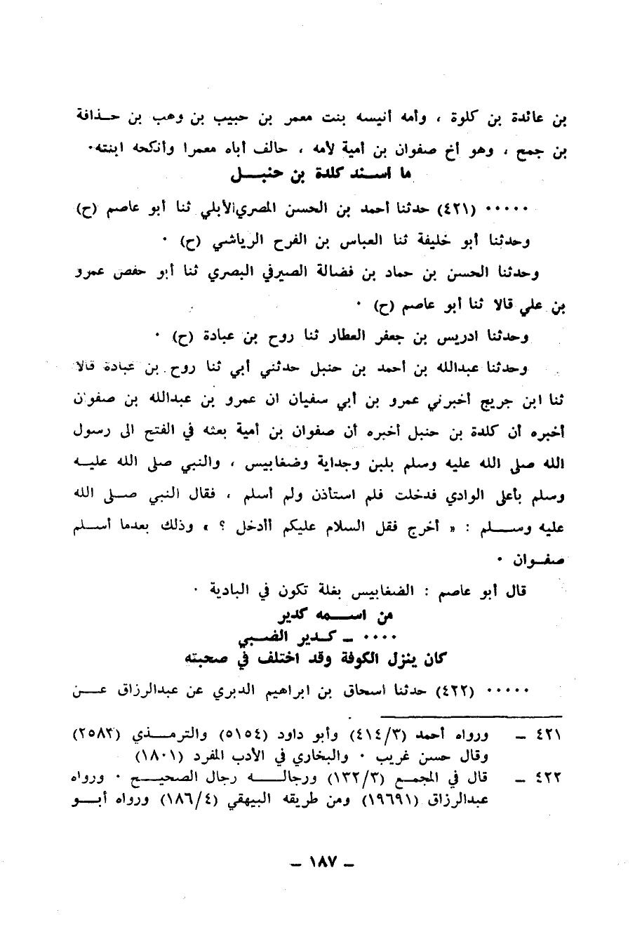 421 - حَدَّثَنَا أَحْمَدُ بْنُ الْحَسَنِ الْمِصْرِيُّ الْأُبُلِّيُّ، ثنا أَبُو عَاصِمٍ، ح وَحَدَّثَنَا أَبُو خَلِيفَةَ، ثنا الْعَبَّاسُ بْنُ الْفَرَجِ الرِّيَاشِيُّ، ح وَحَدَّثَنَا الْحَسَنُ بْنُ حَمَّادِ بْنِ فَضَالَةَ الصَّيْرَفِيُّ الْبَصْرِيُّ، ثنا أَبُو حَفْصٍ عَمْرُو بْنُ عَلِيٍّ قَالَا: ثنا أَبُو عَاصِمٍ، ح وَحَدَّثَنَا إِدْرِيسُ بْنُ جَعْفَرٍ الْعَطَّارُ، ثنا رَوْحُ بْنُ عُبَادَةَ، ح وَحَدَّثَنَا عَبْدُ اللهِ بْنُ أَحْمَدَ بْنِ حَنْبَلٍ، حَدَّثَنِي أَبِي، ثنا رَوْحُ بْنُ عُبَادَةَ قَالَا: ثنا ابْنُ جُرَيْجٍ، أَخْبَرَنِي عَمْرُو بْنُ أَبِي سُفْيَانَ، أَنَّ عَمْرَو بْنَ عَبْدِ اللهِ بْنِ صَفْوَانَ، أَخْبَرَهُ، أَنَّ كَلَدَةَ بْنَ حَنْبَلٍ أَخْبَرَهُ، أَنَّ صَفْوَانَ بْنَ أُمَيَّةَ بَعَثَهُ فِي الْفَتْحِ إِلَى رَسُولِ اللهِ صَلَّى اللهُ عَلَيْهِ وَسَلَّمَ بِلَبَنٍ وَجِدَايَةٍ وَضَغَابِيسَ، وَالنَّبِيُّ صَلَّى اللهُ عَلَيْهِ وَسَلَّمَ بِأَعْلَى الْوَادِي، §فَدَخَلْتُ فَلَمْ أَسْتَأْذِنْ وَلَمْ أُسَلِّمْ، فَقَالَ النَّبِيُّ صَلَّى اللهُ عَلَيْهِ وَسَلَّمَ: " اخْرُجْ فَقُلِ: السَّلَامُ عَلَيْكُمْ، أَأَدْخُلُ؟ "، وَذَلِكَ بَعْدَمَا أَسْلَمَ صَفْوَانُ. قَالَ أَبُو عَاصِمٍ: الضَّغَابِيسُ: بَغْلَةٌ تَكُونُ فِي الْبَادِيَةِ "