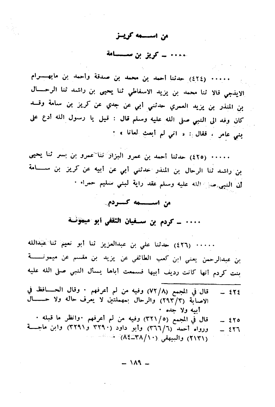 424 - حَدَّثَنَا أَحْمَدُ بْنُ مُحَمَّدِ بْنِ صَدَقَةَ، وَأَحْمَدُ بْنُ مَابِهْرَامَ الْإِيَدْجَيُّ، قَالَا: ثنا مُحَمَّدُ بْنُ يَزِيدَ الْأَسْفَاطِيُّ، ثنا يَحْيَى بْنُ رَاشِدٍ، ثنا الرِّحَالُ بْنُ الْمُنْذِرِ بْنِ يَزِيدَ الْعُمَرِيُّ، حَدَّثَنِي أَبِي، عَنْ جَدِّي، عَنْ كَرِيزِ بْنِ سَامَةَ، وَقَدْ كَانَ وَفَدَ إِلَى النَّبِيِّ صَلَّى اللهُ عَلَيْهِ وَسَلَّمَ قَالَ: قِيلَ: يَا رَسُولَ اللهِ ادْعُ عَلَى بَنِي عَامِرٍ، فَقَالَ: «إِنِّي §لَمْ أُبْعَثْ لَعَّانًا»