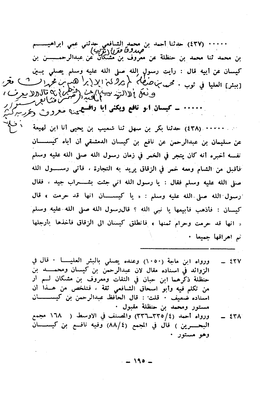 438 - حَدَّثَنَا بَكْرُ بْنُ سَهْلٍ، ثنا شُعَيْبُ بْنُ يَحْيَى، أنا ابْنُ لَهِيعَةَ، عَنْ سُلَيْمَانَ بْنِ عَبْدِ الرَّحْمَنِ، عَنْ نَافِعِ بْنِ كَيْسَانَ الدِّمَشْقِيِّ، أَنَّ أَبَاهُ كَيْسَانَ نَفْسَهُ أَخْبَرَهُ أَنَّهُ كَانَ يَتَّجِرُ فِي الْخَمْرِ فِي زَمَانِ رَسُولِ اللهِ صَلَّى اللهُ عَلَيْهِ وَسَلَّمَ فَأَقْبَلَ مِنَ الشَّامِ وَمَعَهُ خَمْرٌ فِي الزِّقَاقِ يُرِيدُ بِهِ التِّجَارَةَ، فَأَتَى رَسُولَ اللهِ صَلَّى اللهُ عَلَيْهِ وَسَلَّمَ فَقَالَ: يَا رَسُولَ اللهِ إِنِّي جِئْتُ بِشَرَابٍ جَيِّدٍ، فَقَالَ رَسُولُ اللهِ صَلَّى اللهُ عَلَيْهِ وَسَلَّمَ: «يَا كَيْسَانُ إِنَّهَا قَدْ حُرِّمَتْ» ، قَالَ كَيْسَانُ: فَأَذْهَبُ فَأَبِيعُهَا يَا نَبِيَّ اللهِ؟، قَالَ رَسُولُ اللهِ صَلَّى اللهُ عَلَيْهِ وَسَلَّمَ: «إِنَّهَا قَدْ §حُرِّمَتْ، وَحَرَامٌ ثَمَنُهَا» ، فَانْطَلَقَ كَيْسَانُ إِلَى الزِّقَاقِ فَأَخَذَهَا بِأَرْجُلِهَا ثُمَّ أَهْراَقَهَا جَمِيعًا