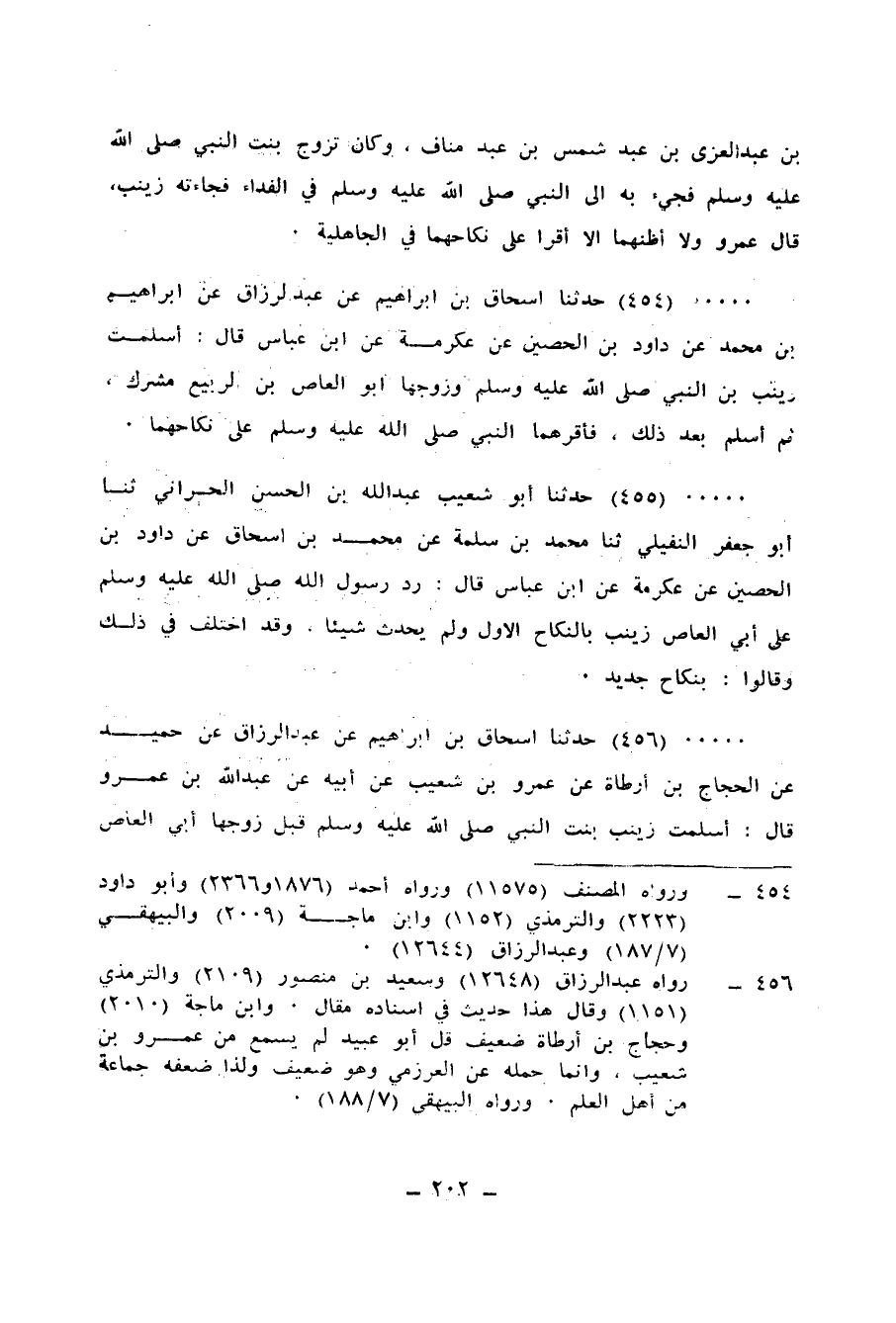 456 - حَدَّثَنَا إِسْحَاقُ بْنُ إِبْرَاهِيمَ الدَّبَرِيُّ، عَنْ عَبْدِ الرَّزَّاقِ، عَنْ حُمَيْدٍ، عَنِ الْحَجَّاجِ بْنِ أَرْطَاةَ، عَنْ عَمْرِو بْنِ شُعَيْبٍ، عَنْ أبِيهِ، عَنْ عَبْدِ اللهِ بْنِ عَمْرٍو، قَالَ: «§أَسْلَمَتْ زَيْنَبُ بِنْتُ النَّبِيِّ صَلَّى اللهُ عَلَيْهِ وَسَلَّمَ قَبْلَ زَوْجِهَا أَبِي الْعَاصِ بْنِ الرَّبِيعِ بِسَنَةٍ، ثُمَّ أَسْلَمَ فَرَدَّهَا النَّبِيُّ صَلَّى اللهُ عَلَيْهِ وَسَلَّمَ بِنِكَاحٍ جَدِيدٍ»