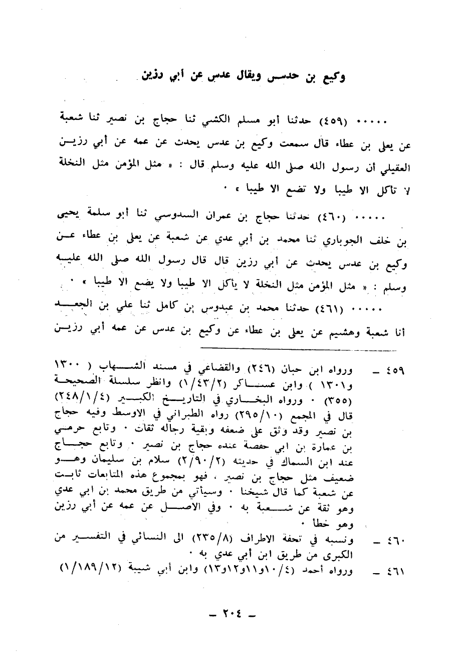 460 - حَدَّثَنَا حَجَّاجُ بْنُ عِمْرَانَ السَّدُوسِيُّ، ثنا أَبُو سَلَمَةَ يَحْيَى بْنُ خَلَفٍ الْجُوبَارِيُّ، ثنا مُحَمَّدُ بْنُ أَبِي عَدِيٍّ، عَنْ شُعْبَةَ، عَنْ يَعْلَى بْنِ عَطَاءٍ، عَنْ وَكِيعِ بْنِ عُدُسٍ، يُحَدِّثُ عَنْ أبِي رَزِينٍ، قَالَ: قَالَ رَسُولُ اللهِ صَلَّى اللهُ عَلَيْهِ وَسَلَّمَ: «§مَثَلُ الْمُؤْمِنِ مِثْلَ النَّحْلَةِ لَا يَأْكُلُ إِلَّا طَيِّبًا، وَلَا يَضَعُ إِلَّا طَيِّبًا»