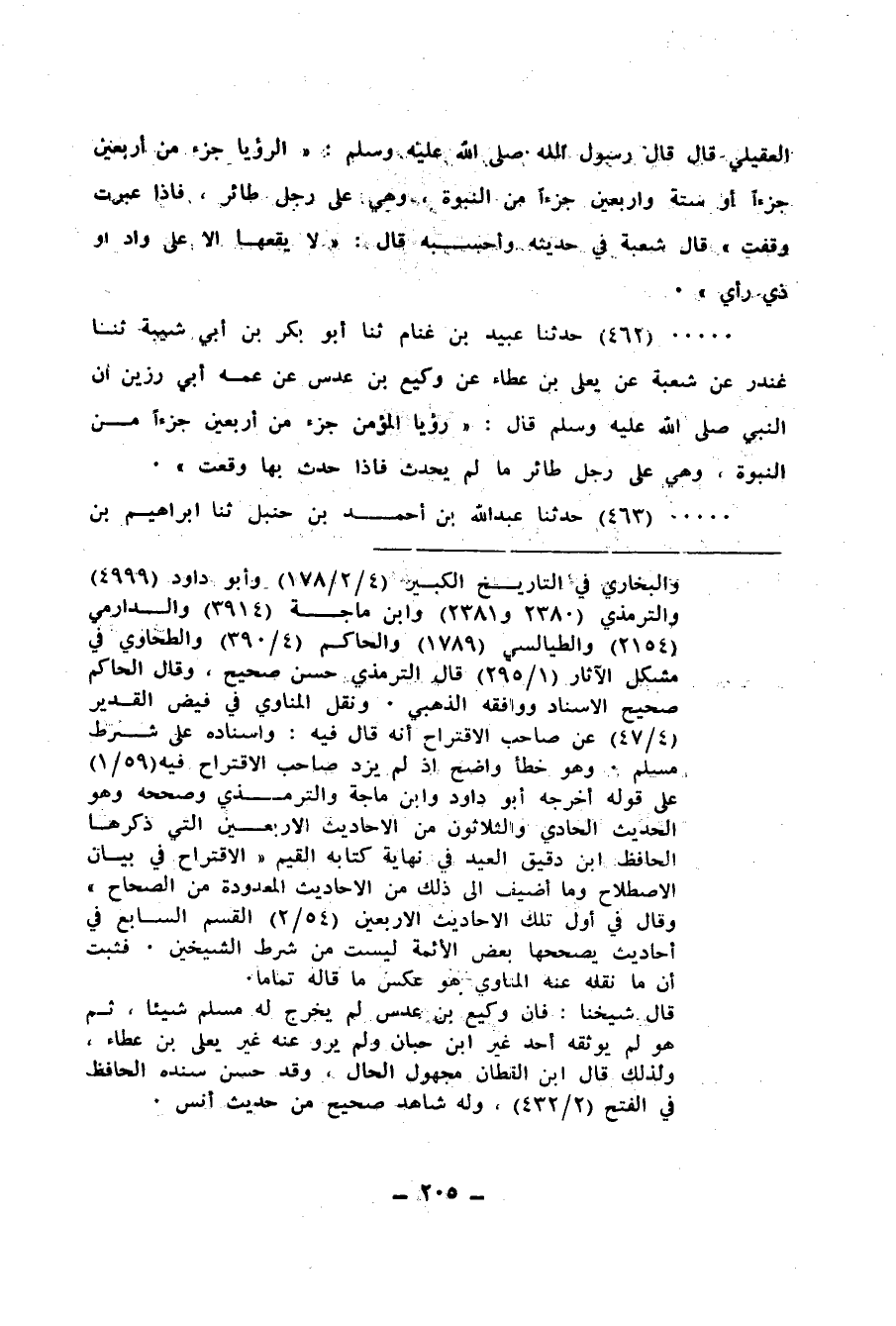 463 - حَدَّثَنَا عَبْدُ اللهِ بْنُ أَحْمَدَ بْنِ حَنْبَلٍ، ثنا إِبْرَاهِيمُ بْنُ الْحَجَّاجِ السَّامِيُّ، ثنا حَمَّادُ بْنُ سَلَمَةَ، عَنْ يَعْلَى بْنِ عَطَاءٍ، عَنْ وَكِيعِ بْنِ حُدُسٍ، عَنْ عَمِّهِ أَبِي رَزِينٍ الْعُقَيْلِيِّ، أَنَّ النَّبِيَّ صَلَّى اللهُ عَلَيْهِ وَسَلَّمَ، قَالَ: «§الرُّؤْيَا جُزْءٌ مِنْ سِتَّةٍ وَأَرْبَعِينَ جُزْءًا مِنَ النُّبُوَّةِ، وَالرُّؤْيَا مُعَلَّقَةٌ بِرِجْلِ طَائِرٍ حَتَّى يُحَدِّثَ بِهَا صَاحِبُهَا، فَإِذَا حَدَّثَ بِهَا وَقَعَتْ، فَلَا يُحَدِّثْ بِهَا إِلَّا عَالِمًا أَوْ نَاصِحًا أَوْ حَبِيبًا»