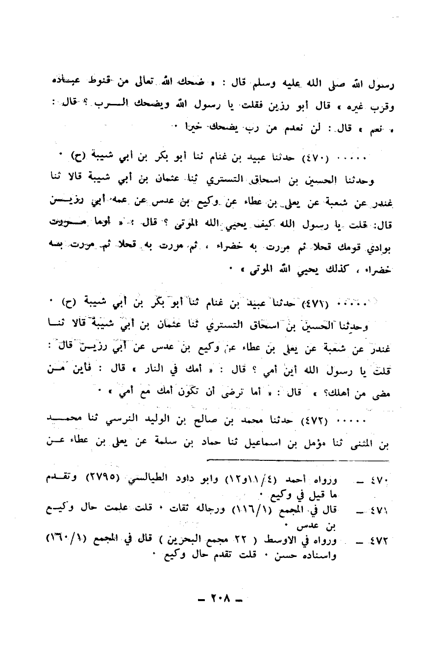 470 - حَدَّثَنَا عُبَيْدُ بْنُ غَنَّامٍ، ثنا أَبُو بَكْرِ بْنُ أَبِي شَيْبَةَ، ح وَحَدَّثَنَا الْحُسَيْنُ بْنُ إِسْحَاقَ التُّسْتَرِيُّ، ثنا عُثْمَانُ بْنُ أَبِي شَيْبَةَ، قَالَا: ثنا غُنْدَرٌ، عَنْ شُعْبَةَ، عَنْ يَعْلَى بْنِ عَطَاءٍ، عَنْ وَكِيعِ بْنِ عُدُسٍ، عَنْ عَمِّهِ أَبِي رَزِينٍ، قَالَ: قُلْتُ: يَا رَسُولَ اللهِ كَيْفَ يُحْيِي اللهُ الْمَوْتَى؟، قَالَ: «§أَوَمَا مَرَرْتَ بِوَادِي قَوْمِكَ قَحْلًا، ثُمَّ مَرَرْتَ بِهِ خَضْرَاءَ، ثُمَّ مَرَرْتَ بِهِ قَحْلًا، ثُمَّ مَرَرْتَ بِهِ خَضْرَاءَ؟، كَذَلِكَ يُحْيِي اللهُ الْمَوْتَى»