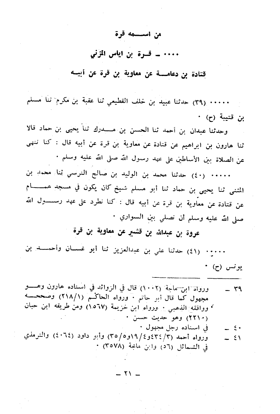 39 - حَدَّثَنَا عُبَيْدُ بْنُ خَلَفٍ الْقَطِيعِيُّ، ثنا عُقْبَةُ بْنُ مُكْرَمٍ، ثنا مُسْلِمُ بْنُ قُتَيْبَةَ، ح وَحَدَّثَنَا عَبْدَانُ بْنُ أَحْمَدَ، ثنا الْحَسَنُ بْنُ مُدْرِكٍ، ثنا يَحْيَى بْنُ حَمَّادٍ، قَالَا: ثنا هَارُونُ بْنُ إِبْرَاهِيمَ، عَنْ قَتَادَةَ، عَنْ مُعَاوِيَةَ بْنِ قُرَّةَ، عَنْ أَبِيهِ، قَالَ: «كُنَّا §نُنْهَى عَنِ الصَّلَاةِ بَيْنَ الْأَسَاطِينِ عَلَى عَهْدِ رَسُولِ اللهِ صَلَّى اللهُ عَلَيْهِ وَسَلَّمَ»