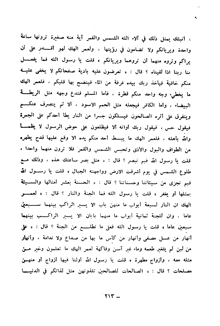 قُلْتُ: يَا رَسُولَ اللهِ §فَمَا يَفْعَلُ بِنَا رَبُّنَا إِذَا لَقِينَاهُ؟، قَالَ: " تُعْرَضُونَ عَلَيْهِ بَادِيَةً صَفَحَاتُكُمْ لَا يَخْفَى عَلَيْهِ مِنْكُمْ خَافِيَةٌ، فَيَأْخُذُ رَبُّكَ بِيَدِهِ غَرْفَةً مِنَ الْمَاءِ فَيَنْضَحُ بِهَا قبلكمْ، فَلَعَمْرُ إِلَهِكَ مَا يُخْطِئُ وَجْهَ وَاحِدٍ مِنْكُمْ قَطْرَةٌ، فَأَمَّا الْمُسْلِمُ فَتَدَعُ وَجْهَهُ مِثْلَ الرَّيْطَةِ الْبَيْضَاءِ، وَأَمَّا الْكَافِرُ فَيَجْعَلُهُ مِثْلَ الْحُمَمِ الْأَسْوَدِ، أَلَا ثُمَّ يَنْصَرِفُ عَنْكُمْ، وَيَتَفَرَّقُ عَلَى أَثَرِهَ الصَّالِحُونَ فَيَسْلُكُونَ جِسْرًا مِنَ النَّارِ يَطَأُ أَحَدُكُمْ عَلَى الْجَمْرَةِ، فَيَقُولُ: حَسِّ، فَيَقُولُ رَبُّكَ: أَوَانُهُ، أَلَا فَيَظْلَعُونَ عَلَى حَوْضِ الرَّسُولِ لَا يَظْمَأُ وَاللهِ بِأَهْلِهِ، فَلَعَمْرُ إِلَهِكَ مَا يَبْسُطُ أَحَدٌ مِنْكُمْ يَدَهُ إِلَّا وَقَعَ عَلَيْهَا قَدَحٌ يُطَهِّرُهُ مِنَ الطَّوَافِ وَالْبَوْلِ وَالْأَذَى، وَتُحْبَسُ الشَّمْسُ وَالْقَمَرُ فَلَا تَرَوْنَ مِنْهُمَا وَاحِدًا "