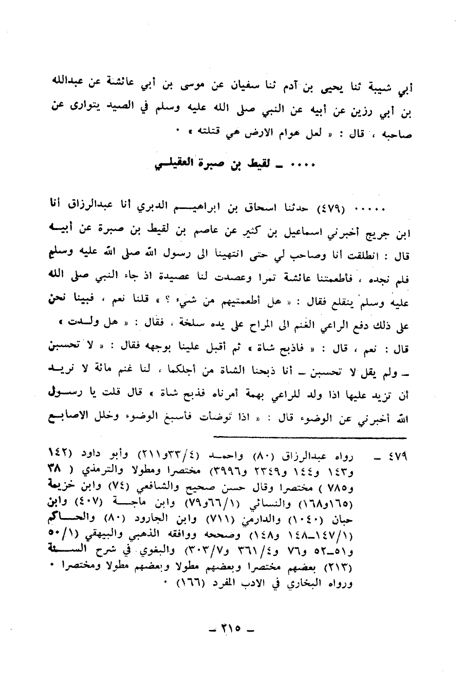 479 - حَدَّثَنَا إِسْحَاقُ بْنُ إِبْرَاهِيمَ الدَّبَرِيُّ، أنا عَبْدُ الرَّزَّاقِ، أنا ابْنُ جُرَيْجٍ، أَخْبَرَنِي إِسْمَاعِيلُ بْنُ كَثِيرٍ، عَنْ عَاصِمِ بْنِ لَقِيطِ بْنِ صَبِرَةَ، عَنْ أَبِيهِ، قَالَ: انْطَلَقْتُ أَنَا وَصَاحِبٌ لِي حَتَّى انْتَهَيْنَا إِلَى رَسُولِ اللهِ صَلَّى اللهُ عَلَيْهِ وَسَلَّمَ فَلَمْ نَجِدْهُ فَأَطْعَمَتْنَا عَائِشَةُ تَمْرًا، وَعَصَدَتْ لَنَا عَصِيدَةً، إِذْ جَاءَ النَّبِيُّ صَلَّى اللهُ عَلَيْهِ وَسَلَّمَ يَنْقَلِعُ، فَقَالَ: «هَلْ أَطْعَمْتِهِمْ مِنْ شَيْءٍ؟» ، قُلْنَا: نَعَمْ، فَبَيْنَا نَحْنُ عَلَى ذَلِكَ دَفَعَ الرَّاعِي الْغَنَمَ إِلَى الْمُرَاحِ، عَلَى يَدِهِ سَخْلَةٌ، فَقَالَ: «هَلْ وَلَدَتْ؟» ، قَالَ: نَعَمْ، قَالَ: «فَاذْبَحْ شَاةً» ، ثُمَّ أَقْبَلَ عَلَيْنَا بِوَجْهِهِ فَقَالَ: " لَا تَحْسَبَنَّ - وَلَمْ يَقُلْ: لَا تَحْسَبُنَّ - أَنَّا ذَبَحْنَا الشَّاةَ مِنْ أَجْلِكُمَا، لَنَا غَنْمٌ مِائَةٌ لَا نُرِيدُ أَنْ تَزِيدَ عَلَيْهَا، §إِذَا وُلِدَ لِلرَّاعِي بَهْمَةٌ أَمَرْنَاهُ فَذَبَحَ شَاةً "
