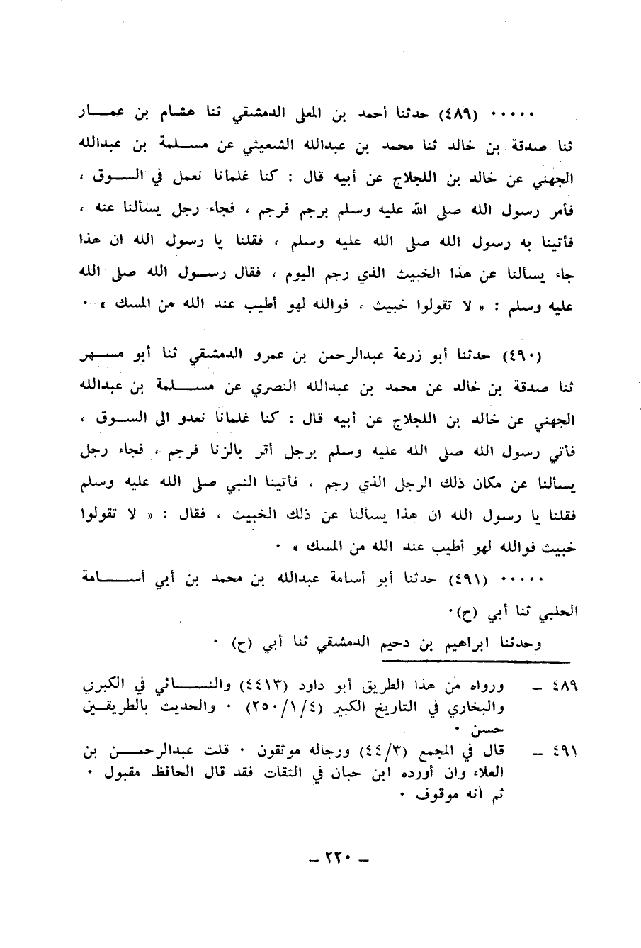 489 - حَدَّثَنَا أَحْمَدُ بْنُ الْمُعَلَّى الدِّمَشْقِيُّ، ثنا هِشَامُ بْنُ عَمَّارٍ، ثنا صَدَقَةُ بْنُ خَالِدٍ، ثنا مُحَمَّدُ بْنُ عَبْدِ اللهِ الشُّعَيْثِيُّ، عَنْ مَسْلَمَةَ بْنِ عَبْدِ اللهِ الْجُهَنِيِّ، عَنْ خَالِدِ بْنِ اللَّجْلَاجِ، عَنْ أَبِيهِ، قَالَ: كُنَّا غِلْمَانًا نَعْمَلُ فِي السُّوقِ فَأَمَرَ رَسُولُ اللهِ صَلَّى اللهُ عَلَيْهِ وَسَلَّمَ بِرَجُلٍ فَرُجِمَ، فَجَاءَ رَجُلٌ يَسْأَلُنَا عَنْهُ، فَأَتَيْنَا بِهِ رَسُولَ اللهِ صَلَّى اللهُ عَلَيْهِ وَسَلَّمَ فَقُلْنَا: يَا رَسُولَ اللهِ إِنَّ §هَذَا جَاءَ يَسْأَلُنَا عَنْ هَذَا الْخَبِيثِ الَّذِي رُجِمَ الْيَوْمَ، فَقَالَ رَسُولُ اللهِ صَلَّى اللهُ عَلَيْهِ وَسَلَّمَ: " لَا تَقُولُوا: خَبِيثٌ، فَوَاللهِ لَهُوَ أَطْيَبُ عِنْدَ اللهِ مِنَ الْمِسْكِ "