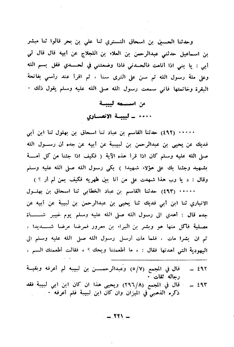 493 - حَدَّثَنَا الْقَاسِمُ بْنُ عَبَّادٍ الْخَطَّابِيُّ، ثنا إِسْحَاقُ بْنُ بُهْلُولٍ الْأَنْبَارِيُّ، ثنا ابْنُ أَبِي فُدَيْكٍ، ثنا يَحْيَى بْنُ عَبْدِ الرَّحْمَنِ بْنِ لَبِيبَةَ، عَنْ أَبِيهِ، عَنْ جَدِّهِ، قَالَ: أُهْدِيَ إِلَى رَسُولِ اللهِ صَلَّى اللهُ عَلَيْهِ وَسَلَّمَ يَوْمَ خَيْبَرٍ شَاةٌ مَصْلِيَّةٌ فَأَكَلَ مِنْهَا هُوَ وَبِشْرُ بْنُ الْبَرَاءِ بْنِ مَعْرُورٍ، فَمَرِضَا مَرَضًا شَدِيدًا، ثُمَّ إِنَّ بَشَرًا مَاتَ، فَلَمَّا مَاتَ أَرْسَلَ رَسُولُ اللهِ صَلَّى اللهُ عَلَيْهِ وَسَلَّمَ إِلَى الْيَهُودِيَّةِ الَّتِي أَهْدَتْهَا، فَقَالَ: «§مَا أَطْعَمْتِنَا وَيْحَكِ؟» ، فَقَالَتْ: أَطْعَمْتُكَ السُّمَّ، قَالَ: «مَا حَمَلَكِ عَلَى ذَلِكَ؟» ، قَالَتْ: إِنِّي سَمِعْتُكَ تَذْكُرُ، فَإِنْ كُنْتَ نَبِيًّا عَلِمْتُ أَنَّهَا لَا تَضُرُّكَ، وَإِنْ كُنْتَ غَيْرَ ذَلِكَ فَأَرَدْتُ أَنْ أُرِيحَ النَّاسَ مِنْكَ، ثُمَّ أَمَرَ بِهَا رَسُولُ اللهِ صَلَّى اللهُ عَلَيْهِ وَسَلَّمَ فَصُلِبَتْ