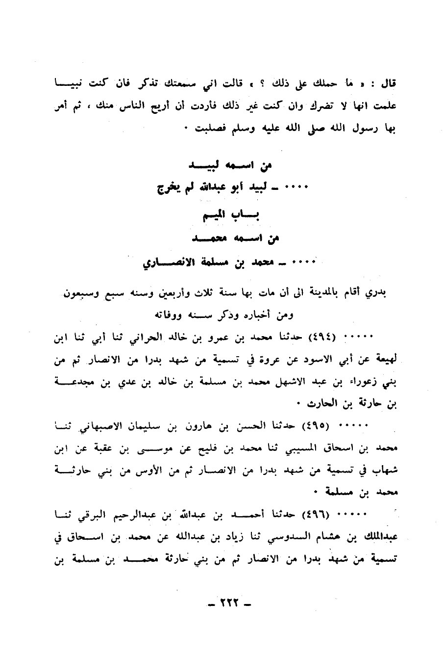 495 - حَدَّثَنَا الْحَسَنُ بْنُ هَارُونَ بْنِ سُلَيْمَانَ الْأَصْبَهَانِيُّ، ثنا مُحَمَّدُ بْنُ إِسْحَاقَ الْمُسَيَّبِيُّ، ثنا مُحَمَّدُ بْنُ فُلَيْحٍ، عَنْ مُوسَى بْنِ عُقْبَةَ، عَنِ ابْنِ شِهَابٍ، «فِي تَسْمِيَةِ مَنْ §شَهِدَ بَدْرًا مِنَ الْأَنْصَارِ ثُمَّ مِنَ الْأَوْسِ مِنْ بَنِي حَارِثَةَ، مُحَمَّدُ بْنُ مَسْلَمَةَ»