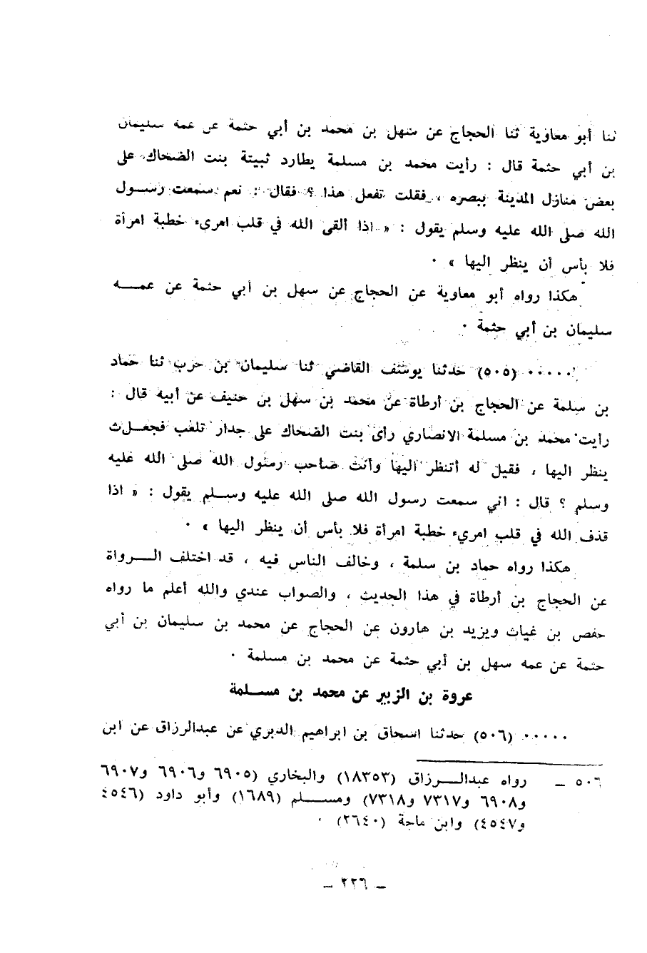 505 - حَدَّثَنَا يُوسُفُ الْقَاضِي، ثنا سُلَيْمَانُ بْنُ حَرْبٍ، ثنا حَمَّادُ بْنُ سَلَمَةَ، عَنِ الْحَجَّاجِ بْنِ أَرْطَأَةَ، عَنْ مُحَمَّدِ بْنِ سَهْلِ بْنِ حُنَيْفٍ، عَنْ أَبِيهِ، قَالَ: رَأَيْتُ مُحَمَّدَ بْنَ مَسْلَمَةَ الْأَنْصَارِيَّ رَأَى بِنْتَ الضَّحَّاكِ عَلَى جِدَارٍ تَلْعَبُ فَجَعَلَ يَنْظُرُ إِلَيْهَا، فَقِيلَ لَهُ: أَتَنْظُرُ إِلَيْهَا وَأَنْتَ صَاحِبُ رَسُولِ اللهِ صَلَّى اللهُ عَلَيْهِ وَسَلَّمَ؟، قَالَ: إِنِّي سَمِعْتُ رَسُولَ اللهِ صَلَّى اللهُ عَلَيْهِ وَسَلَّمَ يَقُولُ: «§إِذَا قَذَفَ اللهُ فِي قَلْبِ امْرِئٍ خِطْبَةَ امْرَأَةٍ فَلَا بَأْسَ أَنْ يَنْظُرَ إِلَيْهَا» هَكَذَا رَوَاهُ حَمَّادُ بْنُ سَلَمَةَ، وَخَالَفَ النَّاسَ فِيهِ، قَدِ اخْتَلَفَ الرُّوَاةُ عَنِ الْحَجَّاجِ بْنِ أَرْطَاةَ فِي هَذَا الْحَدِيثِ، وَالصَّوَابُ عِنْدِي، وَاللهُ أَعْلَمُ، مَا رَوَاهُ حَفْصُ بْنُ غِيَاثٍ، وَيَزِيدُ بْنُ هَارُونَ، عَنِ الْحَجَّاجِ، عَنْ مُحَمَّدِ بْنِ سُلَيْمَانَ بْنِ أَبِي حَثْمَةَ، عَنْ عَمِّهِ سَهْلِ بْنِ أَبِي حَثْمَةَ، عَنْ مُحَمَّدِ بْنِ مَسْلَمَةَ "