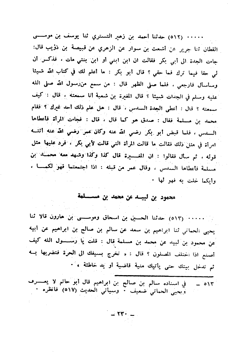 512 - حَدَّثَنَا أَحْمَدُ بْنُ زُهَيْرٍ التُّسْتَرِيُّ، ثنا يُوسُفُ بْنُ مُوسَى الْقَطَّانُ، ثنا جَرِيرٌ، عَنْ أَشْعَثَ بْنِ سَوَّارٍ، عَنِ الزُّهْرِيِّ، عَنْ قَبِيصَةَ بْنِ ذُؤَيْبٍ، قَالَ: جَاءَتِ الْجَدَّةُ إِلَى أَبِي بَكْرٍ فَقَالَتْ: إِنَّ ابْنَ ابْنِي أَوِ ابْنَ ابْنَتِي مَاتَ، فَذَكَرَ أَنَّ لِي حَقًّا فِيمَا تَرَكَ، فَمَا حَقِّي؟، قَالَ أَبُو بَكْرٍ: مَا أَعْلَمُ لَكِ فِي كِتَابِ اللهِ شَيْئًا، وَسَأَسْأَلُ فَارْجِعِي، فَلَمَّا صَلَّى الظُّهْرَ، قَالَ: مَنْ سَمِعَ مِنْ رَسُولِ اللهِ صَلَّى اللهُ عَلَيْهِ وَسَلَّمَ فِي الْجَدَّاتِ شَيْئًا؟، قَالَ الْمُغِيرَةُ بْنُ شُعْبَةَ أَنَا سَمِعْتُهُ، قَالَ: كَيْفَ سَمِعْتَهُ؟، قَالَ: «§أَعْطَى الْجَدَّةَ السُّدُسَ» ، قَالَ: هَلْ عَلِمَ ذَلِكَ أَحَدٌ غَيْرُكُ؟ فَقَامَ مُحَمَّدُ بْنُ مَسْلَمَةَ فَقَالَ: صَدَقَ، هُوَ كَمَا قَالَ، فَجَاءَتِ الْمَرْأَةُ فَأَعْطَاهَا السُّدُسَ، فَلَمَّا قُبِضَ أَبُو بَكْرٍ رَضِيَ اللهُ عَنْهُ، وَكَانَ عُمَرُ رَضِيَ اللهُ عَنْهُ، أَتَتْهُ امْرَأَةٌ فِي مِثْلِ ذَلِكَ فَقَالَتْ مَا قَالَتِ الْمَرْأَةُ الَّتِي قَالَتْ لِأَبِي بَكْرٍ، فَرَدَّ عَلَيْهَا مِثْلَ قَوْلِهِ، ثُمَّ سَأَلَ، فَقَالُوا: إِنَّ الْمُغِيرَةَ قَالَ: كَذَا وَكَذَا وَشَهِدَ مَعَهُ مُحَمَّدُ بْنُ مَسْلَمَةَ فَأَعْطَاهَا السُّدُسَ، وَقَالَ عُمَرُ مِنْ قِبَلِهِ: إِذَا اجْتَمَعْتُمَا فَهُوَ لَكُمَا وَأَيُّكُمَا خَلَتْ بِهِ فَهُوَ لَهَا
