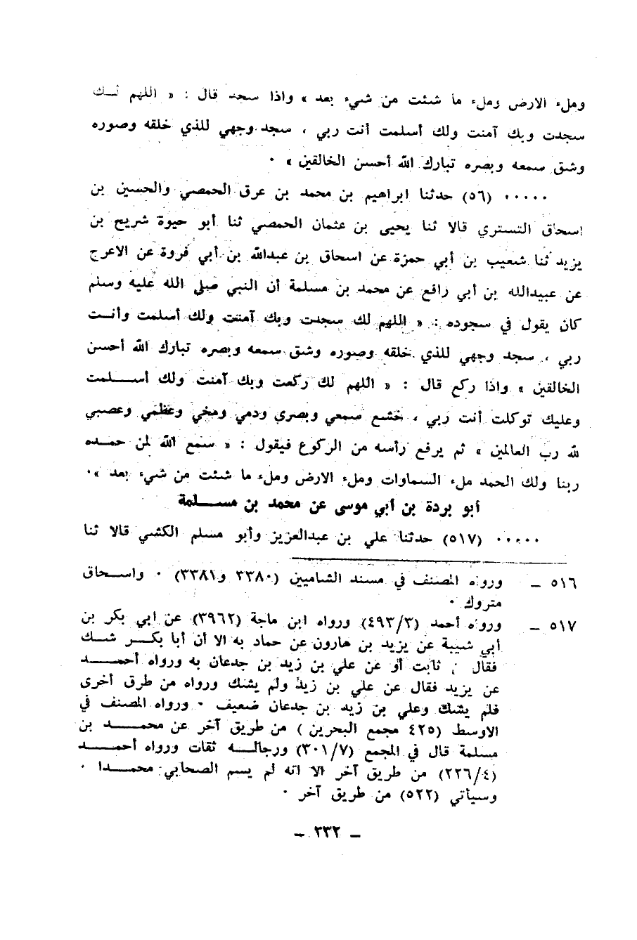 516 - حَدَّثَنَا إِبْرَاهِيمُ بْنُ مُحَمَّدِ بْنِ عِرْقٍ الْحِمْصِيُّ، وَالْحُسَيْنُ بْنُ إِسْحَاقَ التُّسْتَرِيُّ، قَالَا: ثنا يَحْيَى بْنُ عُثْمَانَ الْحِمْصِيُّ، ثنا أَبُو حَيْوَةَ شُرَيْحُ بْنُ يَزِيدَ ثنا شُعَيْبُ بْنُ أَبِي حَمْزَةَ، عَنْ إِسْحَاقَ بْنِ عَبْدِ اللهِ بْنِ أَبِي فَرْوَةَ، عَنِ الْأَعْرَجِ، عَنْ عُبَيْدِ اللهِ بْنِ أَبِي رَافِعٍ، عَنْ مُحَمَّدِ بْنِ مَسْلَمَةَ: أَنَّ النَّبِيَّ صَلَّى اللهُ عَلَيْهِ وَسَلَّمَ كَانَ §يَقُولُ فِي سُجُودِهِ: «اللهُمَّ لَكَ سَجَدْتُ، وَبِكَ آمَنْتُ، وَلَكَ أَسْلَمْتُ، وَأَنْتَ رَبِّي، سَجَدَ وَجْهِي لِلَّذِي خَلَقَهُ وَصَوَّرَهُ، وَشَقَّ سَمْعَهُ وَبَصَرَهُ، تَبَارَكَ اللهُ أَحْسَنُ الْخَالِقِينَ» ، وَإِذَا رَكَعَ قَالَ: «اللهُمَّ لَكَ رَكَعْتُ وَبِكَ آمَنْتُ وَلَكَ أَسْلَمْتُ وَعَلَيْكَ تَوَكَّلْتُ، أَنْتَ رَبِّي خَشَعَ سَمْعِي وَبَصَرِي وَدَمِي وَمُخِّي وَعَظْمِي وَعَصَبِي لِلَّهِ رَبِّ الْعَالَمِينَ» ، ثُمَّ يَرْفَعُ رَأْسَهُ مِنَ الرُّكُوعِ فَيَقُولُ: «سَمِعَ اللهُ لِمَنْ حَمِدَهُ، رَبَّنَا وَلَكَ الْحَمْدُ مِلْءَ السَّمَاوَاتِ وَمِلْءَ الْأَرْضِ وَمِلْءَ مَا شِئْتَ مِنْ شَيْءٍ بَعْدُ»