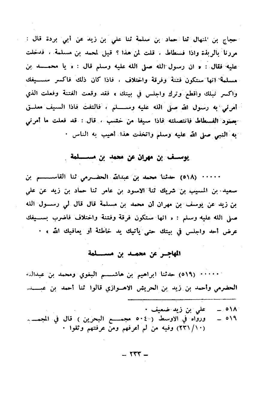 518 - حَدَّثَنَا مُحَمَّدُ بْنُ عَبْدِ اللهِ الْحَضْرَمِيُّ، ثنا الْقَاسِمُ بْنُ سَعِيدِ بْنِ الْمُسَيِّبِ بْنِ شَرِيكٍ، ثنا الْأَسْوَدُ بْنُ عَامِرٍ، ثنا حَمَّادُ بْنُ زَيْدٍ، عَنْ عَلِيِّ بْنِ زَيْدٍ، عَنْ يُوسُفَ بْنِ مِهْرَانَ، أَنَّ مُحَمَّدَ بْنَ مَسْلَمَةَ، قَالَ: قَالَ لِي رَسُولُ اللهِ صَلَّى اللهُ عَلَيْهِ وَسَلَّمَ: " إِنَّهَا §سَتَكُونُ فُرْقَةٌ، وَفِتْنَةٌ، وَاخْتِلَافٌ، فَاضْرِبْ بِسَيْفِكَ عُرْضَ أُحُدٍ، وَاجْلِسْ فِي بَيْتِكَ حَتَّى يَأْتِيَكَ يَدٌ خَاطِئَةٌ أَوْ يُعَافِيَكَ اللهُ