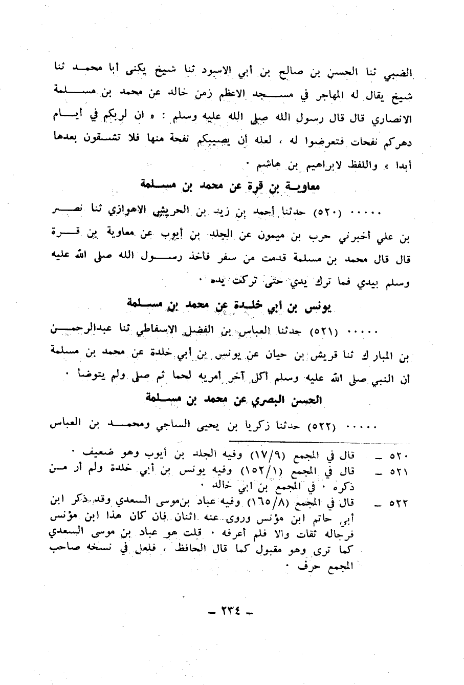 522 - حَدَّثَنَا زَكَرِيَّا بْنُ يَحْيَى السَّاجِيُّ، وَمُحَمَّدُ بْنُ الْعَبَّاسِ الْأَخْرَمِ الْأَصْبَهَانِيُّ، قَالَا: ثنا مُحَمَّدُ بْنُ الْمُثَنَّى، ثنا عَبَّادُ بْنُ مُوسَى السَّعْدِيُّ، ثنا يُونُسُ، عَنِ الْحَسَنِ، عَنْ مُحَمَّدِ بْنِ مَسْلَمَةَ، قَالَ: مَرَرْتُ فَإِذَا رَسُولُ اللهِ صَلَّى اللهُ عَلَيْهِ وَسَلَّمَ عَلَى الصَّفَا وَاضِعًا خَدَّهُ عَلَى خَدِّ رَجُلٍ، فَذَهَبْتُ فَلَمْ أَلْبَثْ أَنْ نَادَانِي رَسُولُ اللهِ صَلَّى اللهُ عَلَيْهِ وَسَلَّمَ، فَقَالَ: «يَا مُحَمَّدُ بْنُ مَسْلَمَةَ مَا مَنَعَكَ أَنْ تُسَلِّمَ؟» ، فَقَالَ مُحَمَّدُ بْنُ مَسْلَمَةَ: يَا رَسُولَ اللهِ رَأَيْتُكَ فَعَلْتَ بِهَذَا الرَّجُلِ شَيْئًا لَمْ تَفْعَلْهُ بِأَحَدٍ مِنَ النَّاسِ، فَكَرِهْتُ أَنْ أَقْطَعَكَ مِنْ حَدِيثِكَ، فَمَنْ كَانَ يَا رَسُولَ اللهِ؟، قَالَ: " كَانَ جِبْرِيلُ صَلَّى الله عَلَيْهِ، وَقَالَ: مَا لِمُحَمَّدِ بْنِ مَسْلَمَةَ لَمْ يُسَلِّمْ؟، أَمَا إِنَّهُ لَوْ سَلَّمَ لَرَدَدْنَا عَلَيْهِ السَّلَامَ "، قَالَ: فَمَا قَالَ لَكَ يَا رَسُولَ اللهِ؟، قَالَ: «§مَا زَالَ يُوصِينِي بِالْجَارِ حَتَّى كُنْتُ أَنْتَظِرُ أَنْ يَأْمُرَنِي بِتَوْرِيثِهِ»