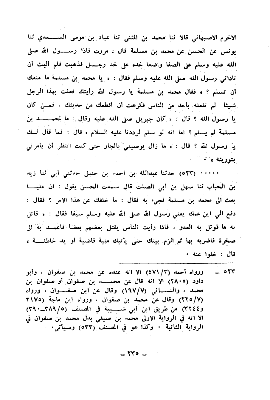523 - حَدَّثَنَا عَبْدُ اللهِ بْنُ أَحْمَدَ بْنِ حَنْبَلٍ، حَدَّثَنِي أَبِي، ثنا زَيْدُ بْنُ الْحُبَابِ، ثنا سَهْلُ بْنُ أَبِي الصَّلْتِ، قَالَ: سَمِعْتُ الْحَسَنَ، يَقُولُ: إِنَّ عَلِيًّا بَعَثَ إِلَى مُحَمَّدِ بْنِ مَسْلَمَةَ فَجِيءَ بِهِ فَقَالَ: مَا خَلَّفَكَ عَنْ هَذَا الْأَمْرِ؟، فَقَالَ: دَفَعَ إِلَيَّ ابْنُ عَمِّكَ، يَعْنِي رَسُولَ اللهِ صَلَّى اللهُ عَلَيْهِ وَسَلَّمَ، سَيْفًا، فَقَالَ: " §قَاتِلْ بِهِ مَا قُوتِلَ بِهِ الْعَدُوُّ، فَإِذَا رَأَيْتَ النَّاسَ يَقْتُلُ بَعْضُهُمْ بَعْضًا فَاعْمَدْ بِهِ إِلَى صَخْرَةٍ فَاضْرِبْهُ بِهَا، ثُمَّ الْزَمْ بَيْتَكَ حَتَّى يَأْتِيَكَ مَنِيَّةٌ قَاضِيَةٌ أَوْ يَدٌ خَاطِئَةٌ، قَالَ: خَلُّوا عَنْهُ