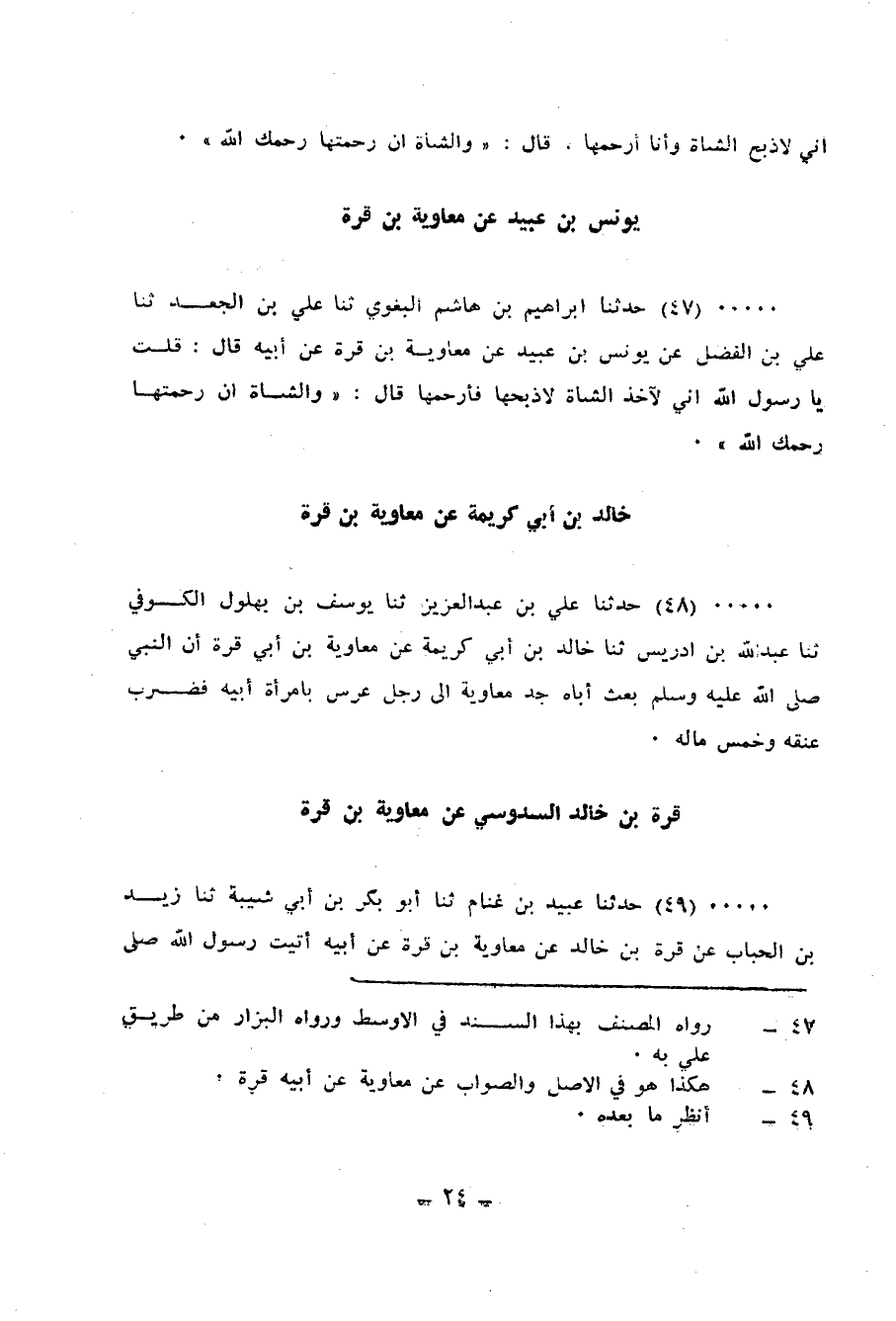 47 - حَدَّثَنَا إِبْرَاهِيمُ بْنُ هَاشِمٍ الْبَغَوِيُّ، ثنا عَلِيُّ بْنُ الْجَعْدِ، ثنا عَلِيُّ بْنُ الْفَضْلِ، عَنْ يُونُسَ بْنِ عُبَيْدٍ، عَنْ مُعَاوِيَةَ بْنِ قُرَّةَ، عَنْ أَبِيهِ، قَالَ: قُلْتُ: يَا رَسُولَ اللهِ إِنِّي لِآخُذُ الشَّاةَ لِأَذْبَحَهَا فَأَرْحَمَهَا، قَالَ: «§وَالشَّاةُ إِنْ رَحِمْتَهَا رَحِمَكَ اللهُ»