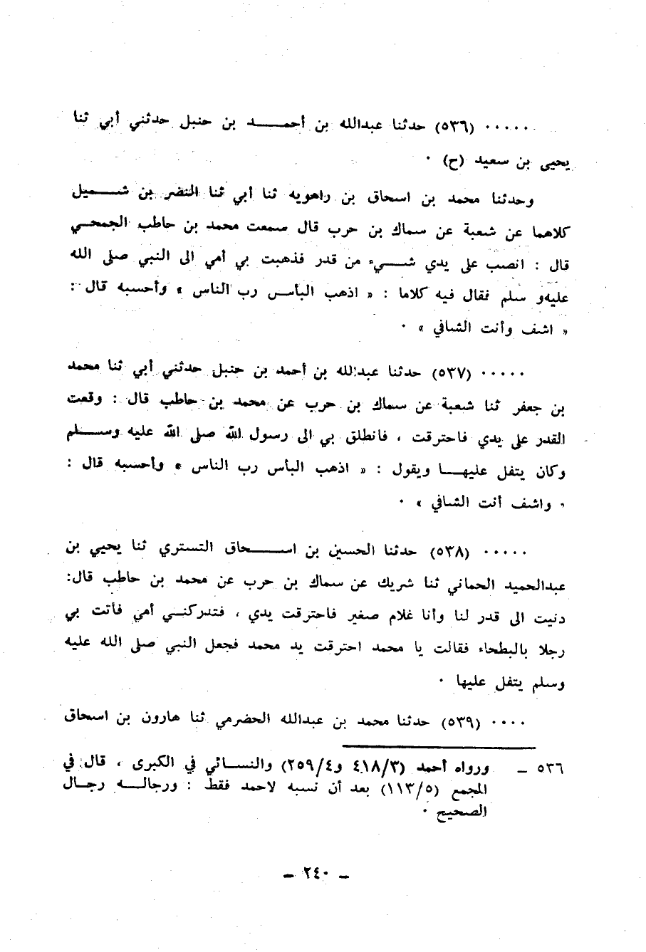536 - حَدَّثَنَا عَبْدُ اللهِ بْنُ أَحْمَدَ بْنِ حَنْبَلٍ، حَدَّثَنِي أَبِي، ثنا يَحْيَى بْنُ سَعِيدٍ، ح وَحَدَّثَنَا مُحَمَّدُ بْنُ إِسْحَاقَ بْنِ رَاهَوَيْهِ، ثنا أَبِي، ثنا النَّضْرُ بْنُ شُمَيْلٍ، كِلَاهُمَا عَنْ شُعْبَةَ، عَنْ سِمَاكِ بْنِ حَرْبٍ، قَالَ: سَمِعْتُ مُحَمَّدَ بْنَ حَاطِبٍ الْجُمَحِيَّ، قَالَ: §انْصَبَّ عَلَى يَدِي شَيْءٌ مِنْ قِدْرٍ، فَذَهَبَتْ بِي أُمِّي إِلَى النَّبِيِّ صَلَّى اللهُ عَلَيْهِ وَسَلَّمَ، فَقَالَ فِيهِ كَلَامًا: «أَذْهِبِ الْبَأْسَ رَبَّ النَّاسِ» ، وَأَحْسَبُهُ قَالَ: «اشْفِ وَأَنْتَ الشَّافِي»