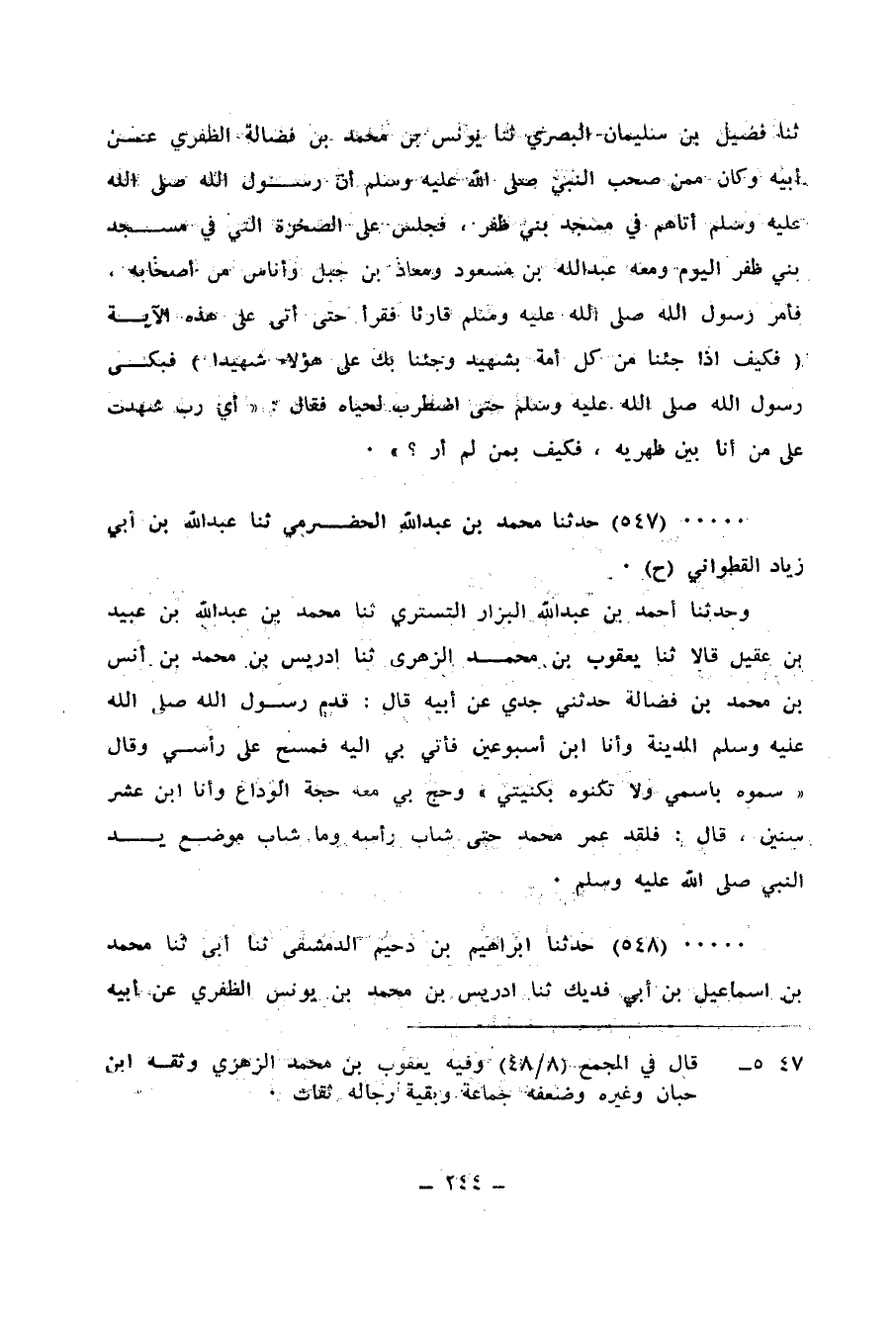 547 - حَدَّثَنَا مُحَمَّدُ بْنُ عَبْدِ اللهِ الْحَضْرَمِيُّ، ثنا عَبْدُ اللهِ بْنُ أَبِي زِيَادٍ الْقَطَوَانِيُّ، ح وَحَدَّثَنَا أَحْمَدُ بْنُ عَبْدِ اللهِ الْبَزَّازُ التُّسْتَرِيُّ، ثنا مُحَمَّدُ بْنُ عَبْدِ اللهِ بْنِ عُبَيْدِ بْنِ عَقِيلٍ، قَالَا: ثنا يَعْقُوبُ بْنُ مُحَمَّدٍ الزُّهْرِيُّ، ثنا إِدْرِيسُ بْنُ مُحَمَّدِ بْنِ أَنَسَ بْنِ مُحَمَّدِ بْنِ فَضَالَةَ، حَدَّثَنِي جَدِّي، عَنْ أَبِيهِ، قَالَ: قَدِمَ رَسُولُ اللهِ صَلَّى اللهُ عَلَيْهِ وَسَلَّمَ الْمَدِينَةَ وَأَنَا ابْنُ أُسْبُوعَيْنِ، فَأُتِيَ بِي إِلَيْهِ فَمَسَحَ عَلَى رَأْسِي، وَقَالَ: «§سَمُّوهُ بِاسْمِي، وَلَا تُكَنُّوهُ بِكُنْيَتِي» . وَحَجَّ بِي مَعَهُ حَجَّةَ الْوَدَاعِ وَأَنَا ابْنُ عَشْرِ سِنِينٍ، قَالَ: فَلَقَدْ عُمِّرَ مُحَمَّدٌ حَتَّى شَابَ رَأْسُهُ، وَمَا شَابَ مَوْضِعُ يَدِ النَّبِيِّ صَلَّى اللهُ عَلَيْهِ وَسَلَّمَ