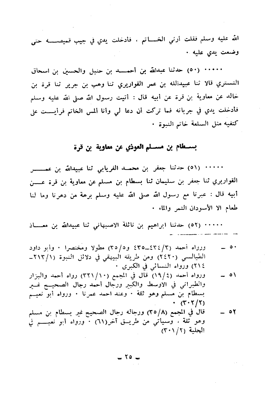 50 - حَدَّثَنَا عَبْدُ اللهِ بْنُ أَحْمَدَ بْنِ حَنْبَلٍ، وَالْحُسَيْنُ بْنُ إِسْحَاقَ التُّسْتَرِيُّ، قَالَا: ثنا عُبَيْدُ اللهِ بْنُ عُمَرَ الْقَوَارِيرِيُّ، ثنا وَهْبُ بْنُ جَرِيرٍ، ثنا قُرَّةُ بْنُ خَالِدٍ، عَنْ مُعَاوِيَةَ بْنِ قُرَّةَ، عَنْ أَبِيهِ، قَالَ: «أَتَيْتُ رَسُولَ اللهِ صَلَّى اللهُ عَلَيْهِ وَسَلَّمَ، §فَأَدْخَلْتُ يَدِي فِي جُرُبَّانِهِ، فَمَا تَرَكْتُ أَنْ دَعَا لِي وَأَنَا أَلْمَسُ الْخَاتَمَ، فَرَأَيْتُ عَلَى كَتِفَيْهِ مِثْلَ السِّلْعَةِ خَاتَمَ النُّبُوَّةِ»