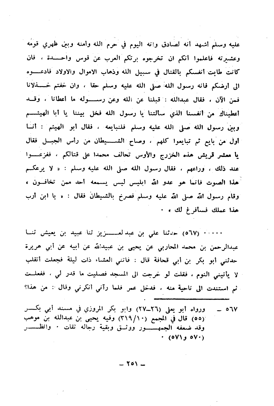 567 - حَدَّثَنَا عَلِيُّ بْنُ عَبْدِ الْعَزِيزِ، ثنا عُبَيْدُ بْنُ يَعِيشَ، ثنا عَبْدُ الرَّحْمَنِ بْنُ مُحَمَّدٍ الْمُحَارِبِيُّ، عَنْ يَحْيَى بْنِ عُبَيْدِ اللهِ، عَنْ أَبِيهِ، عَنْ أَبِي هُرَيْرَةَ، حَدَّثَنِي أَبُو بَكْرِ بْنُ أَبِي قُحَافَةَ، قَالَ: فَاتَنِيَ الْعِشَاءُ ذَاتَ لَيْلَةٍ فَجَعَلْتُ أَتَقَلَّبُ لَا يَأْتِينِي النَّوْمُ، فَقُلْتُ: لَوْ خَرَجْتُ إِلَى الْمَسْجِدِ فَصَلَّيْتُ مَا قُدِّرَ لِي، فَفَعَلْتُ ثُمَّ اسْتَنَدْتُ إِلَى نَاحِيَةٍ مِنْهُ فَدَخَلَ عُمَرُ، فَلَمَّا رَآنِي أَنْكَرَنِي، وَقَالَ: مَنْ هَذَا؟ -[252]-، فَقُلْتُ: أَبُو بَكْرٍ، قَالَ: مَا أَخْرَجَكَ هَذِهِ السَّاعَةَ؟، قُلْتُ: الْجُوعُ، قَالَ: وَأَنَا مَا أَخْرَجَنِي إِلَّا الَّذِي أَخْرَجَكَ، فَلَمْ يَلْبَثْ أَنْ دَخَلَ رَسُولُ اللهِ صَلَّى اللهُ عَلَيْهِ وَسَلَّمَ، فَلَمَّا رَأَى سَوَادَنَا أَنْكَرَهُ، فَقَالَ: «مَنْ هَذَانِ؟» ، فَبَدَرَنِي عُمَرُ فَقَالَ: هَذَا أَبُو بَكْرٍ، وَهَذَا عُمَرُ، فَقَالَ: «مَا أَخْرَجَكُمَا هَذِهِ السَّاعَةَ؟» ، فَأَخْبَرْنَاهُ الْخَبَرَ، قَالَ: «وَأَنَا مَا أَخْرَجَنِي إِلَّا الَّذِي أَخْرَجَكُمَا، انْطَلِقُوا بِنَا إِلَى مَنْزِلِ الْوَاقِمِيِّ» ، فَأَتَيْنَا الْبَابَ فَاسْتَأْذَنَّا فَخَرَجَتِ الْمَرْأَةُ فَقَالَ: «أَيْنَ فُلَانٌ؟» ، قَالَتْ: ذَهَبَ يَسْتَعْذِبُ لَنَا مِنْ حَشِّ بَنِي حَارِثَةَ، فَفَتَحْتِ الْبَابَ فَدَخَلْنَا، فَلَمْ نَلْبَثْ أَنْ جَاءَ حَامِلًا قِرْبَةً عَلَى ظَهْرِهِ حَتَّى عَلَّقَهَا فِي كَرْنَفَةٍ مِنْ كَرَانِفِ النَّخْلِ، ثُمَّ أَقْبَلَ إِلَيْنَا، فَقَالَ: مَرْحَبًا وَأَهْلًا، مَا زَارَ النَّاسَ خَيْرٌ مِنْ زَوْرٍ زَارُونِي اللَّيْلَةَ، ثُمَّ جَاءَ بِعِذْقِ بُسْرٍ فَجَعَلْنَا نَنْتَقِي فِي الْقَمَرِ وَنَأْكُلُ، ثُمَّ أَخَذَ الشَّفْرَةَ وَجَالَ فِي الْغَنَمِ، فَقَالَ لَهُ رَسُولُ اللهِ صَلَّى اللهُ عَلَيْهِ وَسَلَّمَ: «إِيَّاكَ وَالْحَلُوبَ» ، أَوْ قَالَ: «ذَاتَ الدَّرِّ» ، فَذَبَحَ لَنَا شَاةً وَسَلَخَهَا وَقَطَّعَهَا فِي الْقِدْرِ، وَأَمَرَ الْمَرْأَةَ فَعَجَنَتْ وَخَبَزَتْ، ثُمَّ جَاءَنَا بِثَرِيدَةٍ وَلَحْمٍ فَأَكَلْنَا، ثُمَّ قَامَ إِلَى الْقِرْبَةِ وَقَدْ تَخَفَّقْهَا الرِّيحُ فَبَرَدَتْ فَأَسْقَانَا، فَقَالَ النَّبِيُّ صَلَّى اللهُ عَلَيْهِ وَسَلَّمَ: «الْحَمْدُ لِلَّهِ §خَرَجْنَا لَمْ يُخْرِجْنَا إِلَّا الْجُوعُ، ثُمَّ لَمْ نَرْجِعْ حَتَّى أَصَبْنَا هَذَا، هَذَا مِنَ النَّعِيمِ الَّذِي تُسْأَلُونَ عَنْهُ يَوْمَ الْقِيَامَةِ»