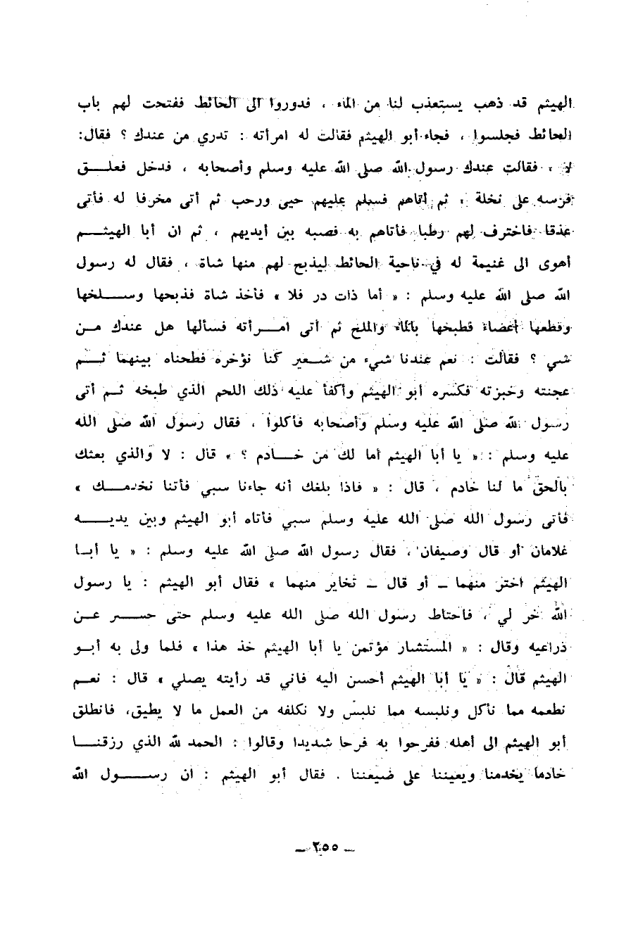 ثُمَّ أَتَى امْرَأَتَهُ فَسَأَلَهَا : هَلْ عِنْدَكِ مِنْ شَيْءٍ ؟ فَقَالَتْ : نَعَمْ ، عِنْدَنَا شَيْءٌ مِنْ شَعِيرٍ كُنَّا نُؤَخِّرُهُ ، فَطَحَنَاهُ بَيْنَهُمَا ، ثُمَّ عَجَنَتْهُ وَخَبَزَتْهُ ، فَكَسَرَهُ أَبُو الْهَيْثَمِ وَأَكْفَأَ عَلَيْهِ ذَلِكَ اللَّحْمَ الَّذِي طَبَخَهُ ، ثُمَّ أَتَى رَسُولَ اللهِ صَلَّى اللَّهُ عَلَيْهِ وَسَلَّمَ وَأَصْحَابَهُ فَأَكَلُوا . فَقَالَ رَسُولُ اللهِ صَلَّى اللَّهُ عَلَيْهِ وَسَلَّمَ : يَا أَبَا الْهَيْثَمِ أَمَا لَكَ مِنْ خَادِمٍ ؟ قَالَ : لاَ ، وَالَّذِي بَعَثَكَ بِالْحَقِّ ، مَا لَنَا خَادِمٌ ، قَالَ : فَإِذَا بَلَغَكَ أَنَّهُ جَاءَنَا سَبْيٌ فَائْتِنَا نَخْدِمُكَ ، فَأَتَى رَسُولَ اللهِ صَلَّى اللَّهُ عَلَيْهِ وَسَلَّمَ سَبْيٌ فَأَتَاهُ أَبُو الْهَيْثَمِ ، وَبَيْنَ يَدَيْهِ غُلاَمَانِ ، أَوْ قَالَ : وَصِيفَانِ ، فَقَالَ رَسُولُ اللهِ صَلَّى اللَّهُ عَلَيْهِ وَسَلَّمَ : يَا أَبَا الْهَيْثَمِ اخْتَرْ مِنْهُمَا ، أَوْ قَالَ : تَخَايَرْ مِنْهُمَا ، فَقَالَ أَبُو الْهَيْثَمِ : يَا رَسُولَ اللهِ خِرْ لِي ، فَاحْتَاطَ رَسُولُ اللهِ صَلَّى اللَّهُ عَلَيْهِ وَسَلَّمَ حَتَّى حَسَرَ عَنْ ذِرَاعَيْهِ ، وَقَالَ : الْمُسْتَشَارُ مُؤْتَمَنٌ يَا أَبَا الْهَيْثَمِ خُذْ هَذَا ، فَلَمَّا وَلَّى بِهِ أَبُو الْهَيْثَمِ ، قَالَ : يَا أَبَا الْهَيْثَمِ أَحْسِنْ إِلَيْهِ ، فَإِنِّي قَدْ رَأَيْتُهُ يُصَلِّي ، قَالَ : نَعَمْ ، نُطْعِمُهُ مِمَّا نَأْكُلُ وَنُلْبِسُهُ مِمَّا نَلْبَسُ ، وَلاَ نُكَلِّفُهُ مِنَ الْعَمَلِ مَا لاَ يُطِيقُ ، فَانْطَلَقَ أَبُو الْهَيْثَمِ إِلَى أَهْلِهِ فَفَرِحُوا بِهِ فَرَحًا شَدِيدًا وَقَالُوا : الْحَمْدُ لِلَّهِ الَّذِي رَزَقَنَا خَادِمًا يَخْدِمُنَا وَيُعِينُنَا عَلَى ضَيْعَتِنَا ، فَقَالَ أَبُو الْهَيْثَمِ : إِنَّ رَسُولَ اللهِ صَلَّى اللَّهُ عَلَيْهِ وَسَلَّمَ قَدْ أَوْصَانِي بِهِ ، قَالَتِ امْرَأَتُهُ : نَعَمْ ، نُطْعِمُهُ مِمَّا نَأْكُلُ وَنُلْبِسُهُ مِمَّا نَلْبَسُ ، وَلاَ نُكَلِّفُهُ مِنَ الْعَمَلِ مَا لاَ يُطِيقُ ، قَالَ : إِنَّ رَسُولَ اللهِ صَلَّى اللَّهُ عَلَيْهِ وَسَلَّمَ أَوْصَانِي بِهِ ، قَالَتِ امْرَأَتُهُ : سُبْحَانَ اللهِ خَادِمٌ أَخْدَمَنَا اللَّهُ وَرَسُولُهُ تُرِيدُ أَنْ تَحْرِمَنَاهُ ؟ فَقَالَ أَبُو الْهَيْثَمِ لِلْغُلاَمِ : أَنْتَ حُرٌّ لِوَجْهِ اللهِ ، فَإِنْ أَحْبَبْتَ أَنْ تُقِيمَ مَعَنَا نُطْعِمْكَ مِمَّا نَأْكُلُ وَنُلْبِسْكَ مِمَّا نَلْبَسُ وَلاَ نُكَلِّفْكَ مِنَ الْعَمَلِ إِلاَّ مَا تُطِيقُ ، وَإِنْ شِئْتَ فَاذْهَبْ حَيْثُ شِئْتَ.
