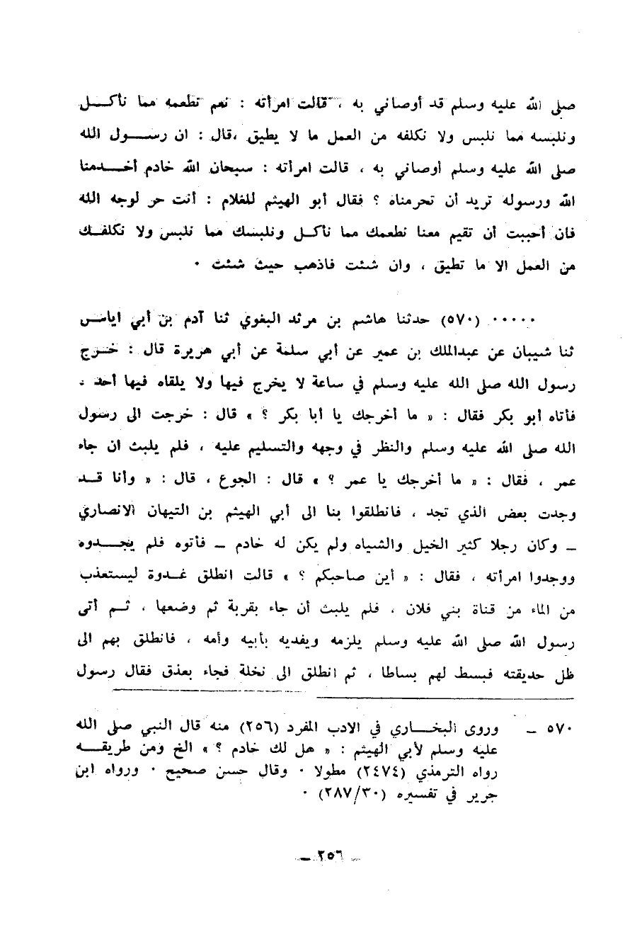 570 - حَدَّثَنَا هَاشِمُ بْنُ مَرْثَدٍ الطَّبَرَانِيُّ، ثنا آدَمُ بْنُ أَبِي إِيَاسٍ، ثنا شَيْبَانُ، عَنْ عَبْدِ الْمَلِكِ بْنِ عُمَيْرٍ، عَنْ أَبِي سَلَمَةَ، عَنْ أَبِي هُرَيْرَةَ، قَالَ: خَرَجَ رَسُولُ اللهِ صَلَّى اللهُ عَلَيْهِ وَسَلَّمَ، فِي سَاعَةٍ لَا يَخْرُجُ فِيهَا وَلَا يَلْقَاهُ فِيهَا أَحَدٌ، فَأَتَاهُ أَبُو بَكْرٍ، فَقَالَ: «مَا أَخْرَجَكَ يَا أَبَا بَكْرٍ؟» ، قَالَ: خَرَجْتُ إِلَى رَسُولِ اللهِ صَلَّى اللهُ عَلَيْهِ وَسَلَّمَ وَالنَّظَرِ فِي وَجْهِهِ وَالتَّسْلِيمِ عَلَيْهِ، فَلَمْ يَلْبَثْ أَنْ جَاءَ عُمَرُ، فَقَالَ: «مَا أَخْرَجَكَ يَا عُمَرُ؟» ، قَالَ: الْجُوعُ، قَالَ: «وَأَنَا قَدْ وَجَدْتُ بَعْضَ الَّذِي تَجِدُ» ، فَانْطَلِقُوا بِنَا إِلَى أَبِي الْهَيْثَمِ بْنِ التَّيْهَانِ الْأَنْصَارِيِّ، وَكَانَ رَجُلًا كَثِيرَ الْخَيْلِ وَالْشِيَاهِ، وَلَمْ يَكُنْ لَهُ خَادِمٌ، فَأَتَوْهُ فَلَمْ يَجِدُوهُ وَوَجَدُوا امْرَأَتَهُ فَقَالَ: «أَيْنَ صَاحِبُكُمْ؟» ، قَالَتِ: انْطَلَقَ غُدْوَةً ليَسْتَعْذِبَ مِنَ الْمَاءِ مِنْ قَنَاةِ بَنِي فُلَانٍ، فَلَمْ يَلْبَثْ أَنْ جَاءَ بِقِرْبَةٍ ثُمَّ وَضَعَهَا، ثُمَّ أَتَى رَسُولَ اللهِ صَلَّى اللهُ عَلَيْهِ وَسَلَّمَ يَلْزَمُهُ وَيُفَدِّيهِ بِأَبِيهِ وَأُمِّهِ، فَانْطَلَقَ بِهِمْ إِلَى ظِلِّ حَدِيقَتِهِ فَبَسَطَ لَهُمْ بِسَاطًا، ثُمَّ انْطَلَقَ إِلَى نَخْلَةٍ فَجَاءَ بِعِذْقٍ، فَقَالَ رَسُولُ اللهِ صَلَّى اللهُ عَلَيْهِ وَسَلَّمَ: «فَهَلَّا تَنَقَّيْتَ مِنْ رُطَبِهِ؟» ، فَقَالَ: أَرَدْتُ أَنْ تُحِسُّونَ مِنْ رُطَبِهِ وَبُسْرِهِ، فَأَكَلُوا وَشَرِبُوا مِنْ ذَلِكَ الْمَاءِ، فَلَمَّا فَرَغَ رَسُولُ اللهِ صَلَّى اللهُ عَلَيْهِ وَسَلَّمَ قَالَ: «§هَذَا وَالَّذِي نَفْسِي بِيَدِهِ مِنَ النَّعِيمِ الَّذِي تُسْأَلُونَ عَنْهُ يَوْمَ الْقِيَامَةِ، هَذَا الظِّلُّ الْبَارِدُ وَالرُّطَبُ الْبَادِ عَلَيْهِ الْمَاءُ» ، انْطَلِقْ فَضَعْ لَهُمْ طَعَامًا، فَقَالَ رَسُولُ اللهِ صَلَّى اللهُ عَلَيْهِ وَسَلَّمَ: «لَا تَذْبَحْ ذَاتَ دَرٍّ» ، فَذَبَحَ لَهُمْ عَنَاقًا أَوْ جَدْيًا، ثُمَّ أَتَاهُمْ فَأَكَلُوا