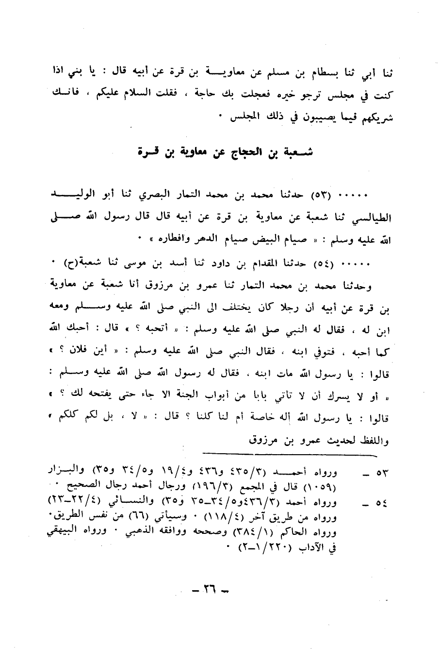 54 - حَدَّثَنَا الْمِقْدَامُ بْنُ دَاوُدَ، ثنا أَسَدُ بْنُ مُوسَى، ثنا شُعْبَةُ، ح وَحَدَّثَنَا مُحَمَّدُ بْنُ مُحَمَّدٍ التَّمَّارُ، ثنا عَمْرُو بْنُ مَرْزُوقٍ، أنا شُعْبَةُ، عَنْ مُعَاوِيَةَ بْنِ قُرَّةَ، عَنْ أَبِيهِ: أَنَّ رَجُلًا كَانَ يَخْتَلِفُ إِلَى النَّبِيِّ صَلَّى اللهُ عَلَيْهِ وَسَلَّمَ وَمَعَهُ ابْنٌ لَهُ، فَقَالَ لَهُ النَّبِيُّ صَلَّى اللهُ عَلَيْهِ وَسَلَّمَ: «أَتُحِبُّهُ؟» ، قَالَ: أَحَبَّكَ اللهُ كَمَا أُحِبُّهُ، فَتُوُفِّيَ ابْنُهُ، فَقَالَ النَّبِيُّ صَلَّى اللهُ عَلَيْهِ وَسَلَّمَ: «§أَيْنَ فُلَانٌ؟» ، قَالُوا: يَا رَسُولَ اللهِ مَاتَ ابْنُهُ، فَقَالَ لَهُ رَسُولُ اللهِ صَلَّى اللهُ عَلَيْهِ وَسَلَّمَ: «أَوَ لَا يَسُرُّكَ أَنْ لَا تَأْتِيَ بَابًا مِنْ أَبْوَابِ الْجَنَّةِ إِلَّا جَاءَ حَتَّى يَفْتَحَهُ لَكَ» ، قَالُوا: يَا رَسُولَ اللهِ: أَلَهُ خَاصَّةً أَمْ لَنَا كُلُّنَا؟، قَالَ: «لَا بَلْ لَكُمْ كُلُّكُمْ» ، «وَاللَّفْظُ لِحَدِيثِ عَمْرِو بْنِ مَرْزُوقٍ»