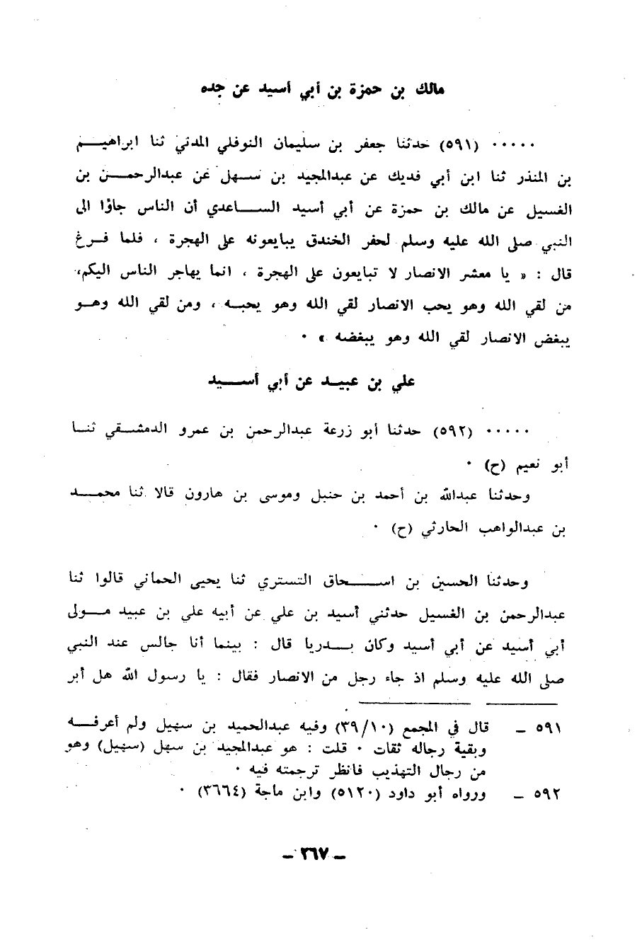 591 - حَدَّثَنَا جَعْفَرُ بْنُ سُلَيْمَانَ النَّوْفَلِيُّ الْمَدَنِيُّ، ثنا إِبْرَاهِيمُ بْنُ الْمُنْذِرِ، ثنا ابْنُ أَبِي فُدَيْكٍ، عَنْ عَبْدِ الْمَجِيدِ بْنِ سُهَيْلٍ، عَنْ عَبْدِ الرَّحْمَنِ بْنِ الْغَسِيلِ، عَنْ مَالِكِ بْنِ حَمْزَةَ، عَنْ أَبِي أُسَيْدٍ السَّاعِدِيِّ، أَنَّ النَّاسَ جَاؤُوا إِلَى النَّبِيِّ صَلَّى اللهُ عَلَيْهِ وَسَلَّمَ لِحَفْرِ الْخَنْدَقِ يُبَايِعُونَهُ عَلَى الْهِجْرَةِ، فَلَمَّا فَرَغَ قَالَ: «يَا مَعْشَرَ الْأَنْصَارِ» §لَا تُبَايِعُونَ عَلَى الْهِجْرَةِ، إِنَّمَا يُهَاجِرُ النَّاسُ إِلَيْكُمْ، مَنْ لَقِيَ اللهَ وَهُوَ يُحِبُّ الْأَنْصَارَ لَقِيَ اللهَ وَهُوَ يُحِبُّهُ، وَمَنْ لَقِيَ اللهَ وَهُوَ يُبْغِضُ الْأَنْصَارَ لَقِيَ اللهَ وَهُوَ يُبْغِضُهُ "