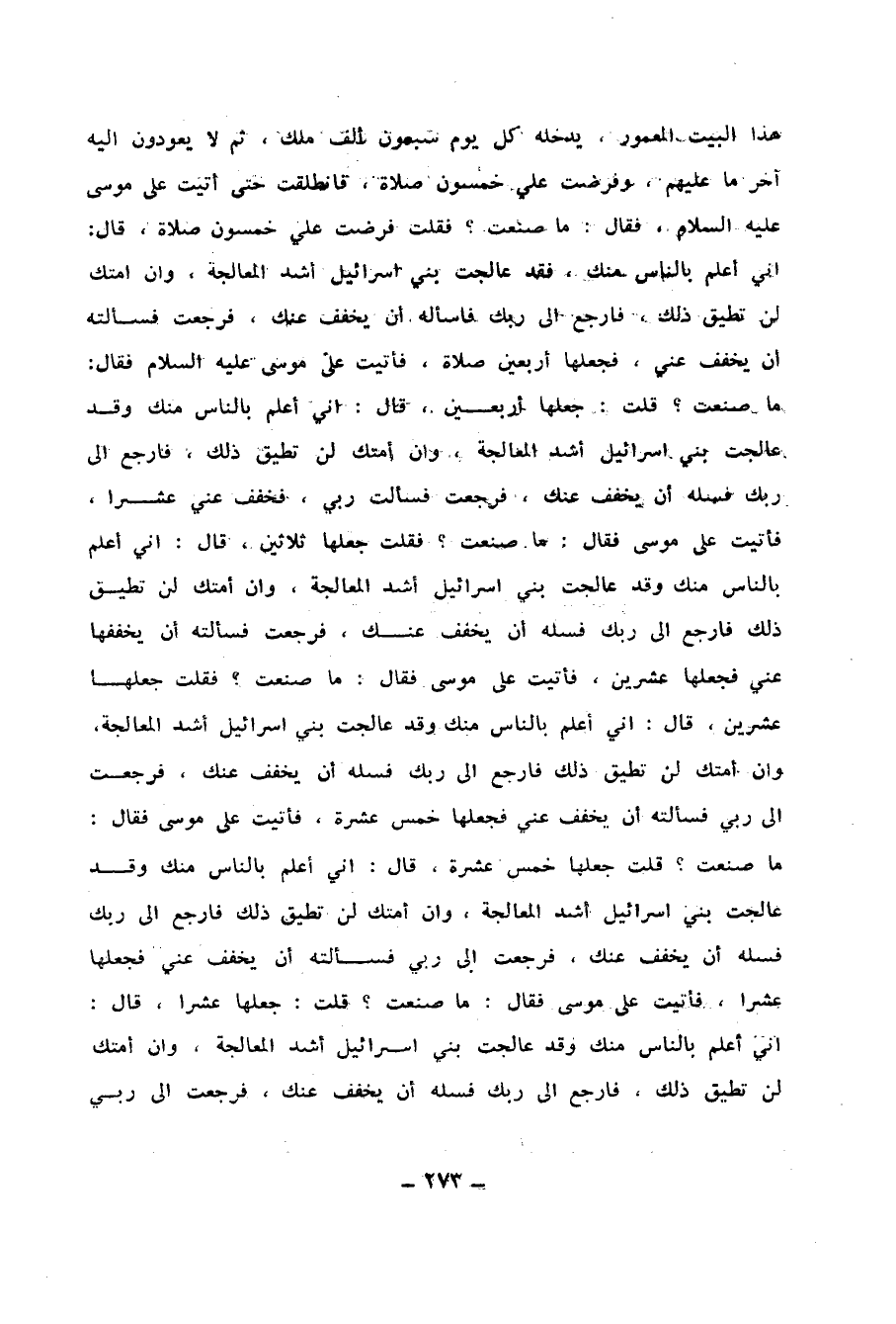 وَفُرِضَتْ عَلِيَّ خَمْسُونَ صَلاَةً ، فَانْطَلَقْتُ حَتَّى أَتَيْتُ عَلَى مُوسَى عَلَيْهِ السَّلاَمُ فَقَالَ : مَا صَنَعْتَ ؟ فَقُلْتُ : فُرِضَتْ عَلِيَّ خَمْسُونَ صَلاَةً ، قَالَ : إِنِّي أَعْلَمُ بِالنَّاسِ مِنْكَ ، فَقَدْ عَالَجْتُ بَنِي إِسْرَائِيلَ أَشَدَّ الْمُعَالَجَةِ ، وَإِنَّ أُمَّتَكَ لَنْ تُطِيقَ ذَلِكَ فَارْجِعْ إِلَى رَبِّكَ فَاسْأَلْهُ أَنْ يُخَفِّفَ عَنْكَ ، فَرَجَعْتُ فَسَأَلْتُهُ أَنْ يُخَفِّفَ عَنِّي فَجَعَلَهَا أَرْبَعِينَ صَلاَةً ، فَأَتَيْتُ عَلَى مُوسَى عَلَيْهِ السَّلاَمُ ، فَقَالَ : مَا صَنَعْتَ ؟ قُلْتُ : جَعَلَهَا أَرْبَعِينَ ، قَالَ : إِنِّي أَعْلَمُ بِالنَّاسِ مِنْكَ ، وَقَدْ عَالَجْتُ بَنِي إِسْرَائِيلَ أَشَدَّ الْمُعَالَجَةِ ، وَإِنَّ أُمَّتَكَ لَنْ تُطِيقَ ذَلِكَ ، فَارْجِعْ إِلَى رَبِّكَ فَسَلْهُ أَنْ يُخَفِّفَ عَنْكَ ، فَرَجَعْتُ فَسَأَلْتُ رَبِّي فَخَفَّفَ عَنِّي عَشْرًا ، فَأَتَيْتُ عَلَى مُوسَى فَقَالَ : مَا صَنَعْتَ ؟ فَقُلْتُ : جَعَلَهَا ثَلاَثِينَ ، قَالَ : إِنِّي أَعْلَمُ بِالنَّاسِ مِنْكَ ، وَقَدْ عَالَجْتُ بَنِي إِسْرَائِيلَ أَشَدَّ الْمُعَالَجَةِ ، وَإِنَّ أُمَّتَكَ لَنْ تُطِيقَ ذَلِكَ ، فَارْجِعْ إِلَى رَبِّكِ فَسَلْهُ أَنْ يُخَفِّفَ عَنْكَ ، فَرَجَعْتُ فَسَأَلْتُهُ أَنْ يُخَفِّفَ عَنِّي فَجَعَلَهَا عِشْرِينَ ، فَأَتَيْتُ عَلَى مُوسَى فَقَالَ : مَا صَنَعْتَ ؟ فَقُلْتُ : جَعَلَهَا عِشْرِينَ ، قَالَ : إِنِّي أَعْلَمُ بِالنَّاسِ مِنْكَ ، وَقَدْ عَالَجْتُ بَنِي إِسْرَائِيلَ أَشَدَّ الْمُعَالَجَةِ ، وَإِنَّ أُمَّتَكَ لَنْ تُطِيقَ ذَلِكَ ، فَارْجِعْ إِلَى رَبِّكِ فَسَلْهُ أَنْ يُخَفِّفَ عَنْكَ ، فَرَجَعْتُ إِلَى رَبِّي فَسَأَلْتُهُ أَنْ يُخَفِّفَ عَنِّي فَجَعَلَهَا خَمْسَ عَشْرَةَ ، فَأَتَيْتُ عَلَى مُوسَى فَقَالَ : مَا صَنَعْتَ ؟ قُلْتُ : جَعَلَهَا خَمْسَ عَشْرَةَ ، قَالَ : إِنِّي أَعْلَمُ بِالنَّاسِ مِنْكَ ، وَقَدْ عَالَجْتُ بَنِي إِسْرَائِيلَ أَشَدَّ الْمُعَالَجَةِ ، وَإِنَّ أُمَّتَكَ لَنْ تُطِيقَ ذَلِكَ ، فَارْجِعْ إِلَى رَبِّكِ فَسَلْهُ أَنْ يُخَفِّفَ عَنْكَ ، فَرَجَعْتُ إِلَى رَبِّي فَسَأَلْتُهُ أَنْ يُخَفِّفَ عَنِّي فَجَعَلَهَا عَشْرًا ، فَأَتَيْتُ عَلَى مُوسَى فَقَالَ : مَا صَنَعْتَ ؟ قُلْتُ : جَعَلَهَا عَشْرًا ، قَالَ : إِنِّي أَعْلَمُ بِالنَّاسِ مِنْكَ ، وَقَدْ عَالَجْتُ بَنِي إِسْرَائِيلَ أَشَدَّ الْمُعَالَجَةِ ، وَإِنَّ أُمَّتَكَ لَنْ تُطِيقَ ذَلِكَ ، فَارْجِعْ إِلَى رَبِّكِ فَسَلْهُ أَنْ يُخَفِّفَ عَنْكَ ، فَرَجَعْتُ إِلَى رَبِّي فَسَأَلْتُهُ أَنْ يُخَفِّفَ عَنِّي فَوَضَعَ عَنِّي خَمْسًا ، فَأَتَيْتُ عَلَى مُوسَى فَقَالَ : مَا صَنَعْتَ ؟ فَقُلْتُ : حَطَّ عَنِّي خَمْسًا ، قَالَ : إِنِّي أَعْلَمُ بِالنَّاسِ مِنْكَ ، وَقَدْ عَالَجْتُ بَنِي إِسْرَائِيلَ أَشَدَّ الْمُعَالَجَةِ ، وَإِنَّ أُمَّتَكَ لَنْ تُطِيقَ ذَلِكَ ، فَارْجِعْ إِلَى رَبِّكِ فَسَلْهُ أَنْ يُخَفِّفَ عَنْكَ ، قُلْتُ : قَدِ اسْتَحْيَيْتُ كَمْ أَرْجِعُ إِلَى رَبِّي ، قَدْ رَضِيتُ وَسَلِمْتَ ، فَنُودِيَ : إِنِّي قَدْ أَمْضَيْتُ فَرِيضَتِي ، وَخَفَّفْتُ عَنْ عِبَادِي ، وَأَجْزِي بِالْحَسَنَةِ عَشْرَ أَمْثَالِهَا.