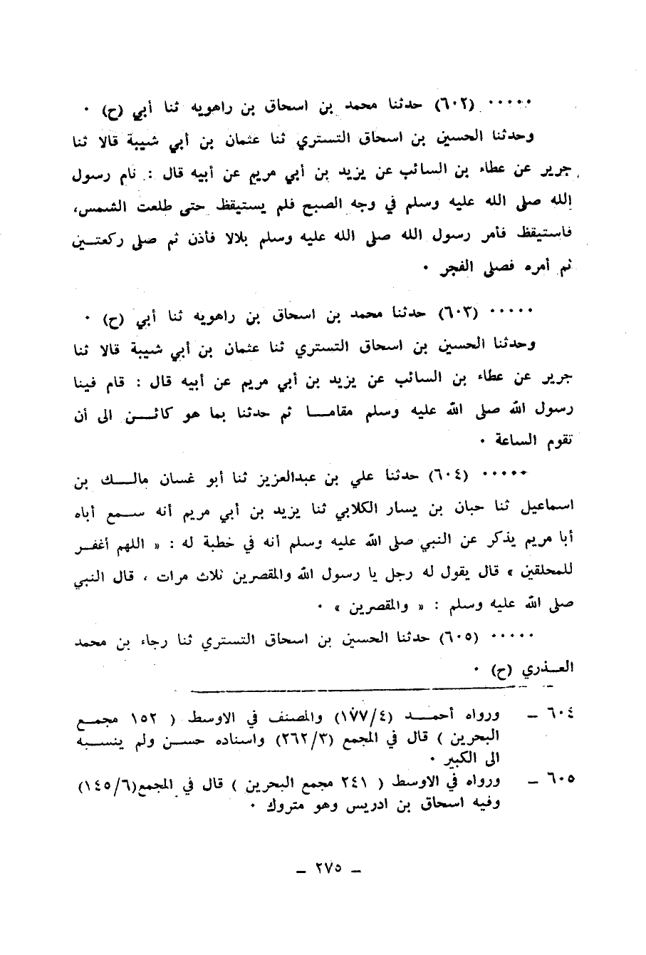 602 - حَدَّثَنَا مُحَمَّدُ بْنُ إِسْحَاقَ بْنِ رَاهَوَيْهِ، ثنا أَبِي، وَحَدَّثَنَا الْحُسَيْنُ بْنُ إِسْحَاقَ التُّسْتَرِيُّ، ثنا عُثْمَانُ بْنُ أَبِي شَيْبَةَ، قَالَا: ثنا جَرِيرُ، عَنْ عَطَاءِ بْنِ السَّائِبِ، عَنْ يَزِيدَ بْنِ أَبِي مَرْيَمَ، عَنْ أبيه قَالَ: «§نَامَ رَسُولُ اللهِ صَلَّى اللهُ عَلَيْهِ وَسَلَّمَ فِي وَجْهِ الصُّبْحِ، فَلَمْ يَسْتَيْقِظْ حَتَّى طَلَعَتِ الشَّمْسُ، فَاسْتَيْقَظُ، فَأَمَرُ رَسُولُ اللهِ صَلَّى اللهُ عَلَيْهِ وَسَلَّمَ بِلَالًا فَأَذَّنَ، ثُمَّ صَلَّى رَكْعَتَيْنِ، ثُمَّ أَمَرَ فَصَلَّى الْفَجْرَ»