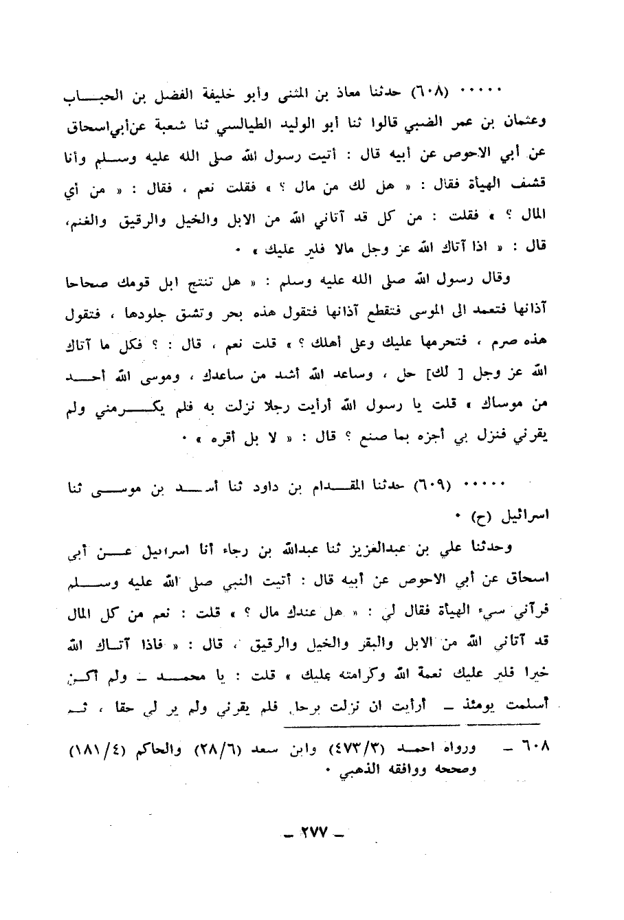 609 - حَدَّثَنَا الْمِقْدَامُ بْنُ دَاوُدَ، ثنا أَسَدُ بْنُ مُوسَى، ثنا إِسْرَائِيلُ، ح وَحَدَّثَنَا عَلِيُّ بْنُ عَبْدِ الْعَزِيزِ، ثنا عَبْدُ اللهِ بْنُ رَجَاءٍ، أَنَا إِسْرَائِيلُ، عَنْ أَبِي إِسْحَاقَ، عَنْ أَبِي الْأَحْوَصِ، عَنْ أَبِيهِ، قَالَ: أَتَيْتُ النَّبِيَّ صَلَّى اللهُ عَلَيْهِ وَسَلَّمَ، فَرَآنِي سَيِّيءَ الْهَيْئَةِ فَقَالَ لِي: «هَلْ عِنْدَكَ مَالٌ؟» ، قُلْتُ: نَعَمْ، مِنْ كُلِّ الْمَالِ قَدْ آتَانِي اللهُ، مِنَ الْإِبِلِ وَالْبَقَرِ وَالْخَيْلِ وَالرَّقِيقِ، قَالَ: «§فَإِذَا آتَاكَ اللهُ خَيْرًا فَلْيُرَ عَلَيْكَ نِعْمَةُ اللهِ وَكَرَامَتُهُ عَلَيْكَ»