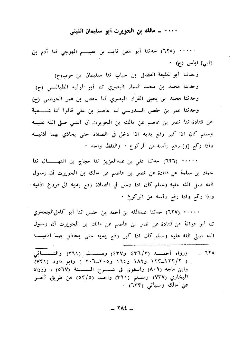 625 - حَدَّثَنَا أَبُو مَعْنٍ ثَابِتُ بْنُ نُعَيْمٍ الْهَوْجِيُّ، ثنا آدَمُ بْنُ أَبِي إِيَاسٍ، ح وَحَدَّثَنَا أَبُو خَلِيفَةَ الْفَضْلُ بْنُ حُبَابٍ، ثنا سُلَيْمَانُ بْنُ حَرْبٍ، ح وَحَدَّثَنَا مُحَمَّدُ بْنُ مُحَمَّدٍ التَّمَّارُ الْبَصْرِيُّ، ثنا أَبُو الْوَلِيدِ الطَّيَالِسِيُّ، وَحَدَّثَنَا مُحَمَّدُ بْنُ يَحْيَى الْقَزَّازُ الْبَصْرِيُّ، ثنا حَفْصُ بْنُ عُمَرَ الْحَوْضِيُّ، ح وَحَدَّثَنَا عُمَرُ بْنُ حَفْصٍ السَّدُوسِيُّ، ثنا عَاصِمُ بْنُ عَلِيٍّ، قَالُوا: ثنا شُعْبَةُ، عَنْ قَتَادَةَ، ثنا نَصْرُ بْنُ عَاصِمٍ، عَنْ مَالِكِ بْنِ الْحُوَيْرِثِ: «أَنَّ النَّبِيَّ صَلَّى اللهُ عَلَيْهِ وَسَلَّمَ كَانَ» §إِذَا كَبَّرَ رَفَعَ يَدَيْهِ إِذَا دَخَلَ فِي الصَّلَاةِ حَتَّى يُحَاذِي بِهِمَا أُذُنَيْهِ، وَإِذَا رَكَعَ وَرَفَعَ رَأْسَهُ مِنَ الرُّكُوعِ، «وَاللَّفْظُ وَاحِدٌ»