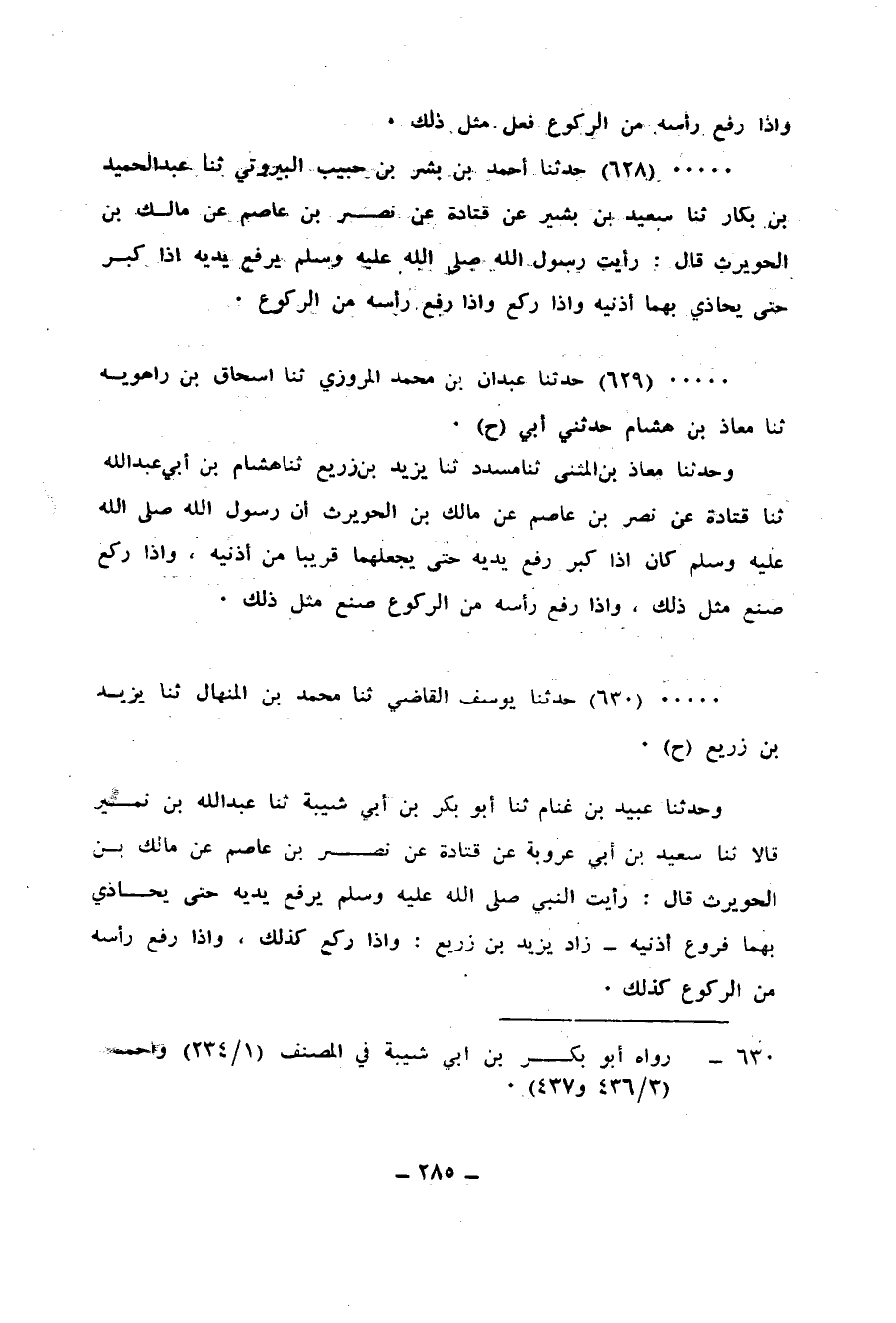 630 - حَدَّثَنَا يُوسُفُ الْقَاضِي، ثنا مُحَمَّدُ بْنُ الْمِنْهَالِ، ثنا يَزِيدُ بْنُ زُرَيْعٍ، ح وَحَدَّثَنَا عُبَيْدُ بْنُ غَنَّامٍ، ثنا أَبُو بَكْرِ بْنُ أَبِي شَيْبَةَ، ثنا عَبْدُ اللهِ بْنُ نُمَيْرٍ، قَالَا: ثنا سَعِيدُ بْنُ أَبِي عَرُوبَةَ، عَنْ قَتَادَةَ، عَنْ نَصْرِ بْنِ عَاصِمٍ، عَنْ مَالِكِ بْنِ الْحُوَيْرِثِ، قَالَ: «رَأَيْتُ النَّبِيَّ صَلَّى اللهُ عَلَيْهِ وَسَلَّمَ» §يَرْفَعُ يَدَيْهِ حَتَّى يُحَاذِي بِهِمَا فُرُوعَ أُذُنَيْهِ ". زَادَ يَزِيدُ بْنُ زُرَيْعٍ: «وَإِذَا رَكَعَ كَذَلِكَ، وَإِذَا رَفَعَ رَأْسَهُ مِنَ الرُّكُوعِ كَذَلِكَ»