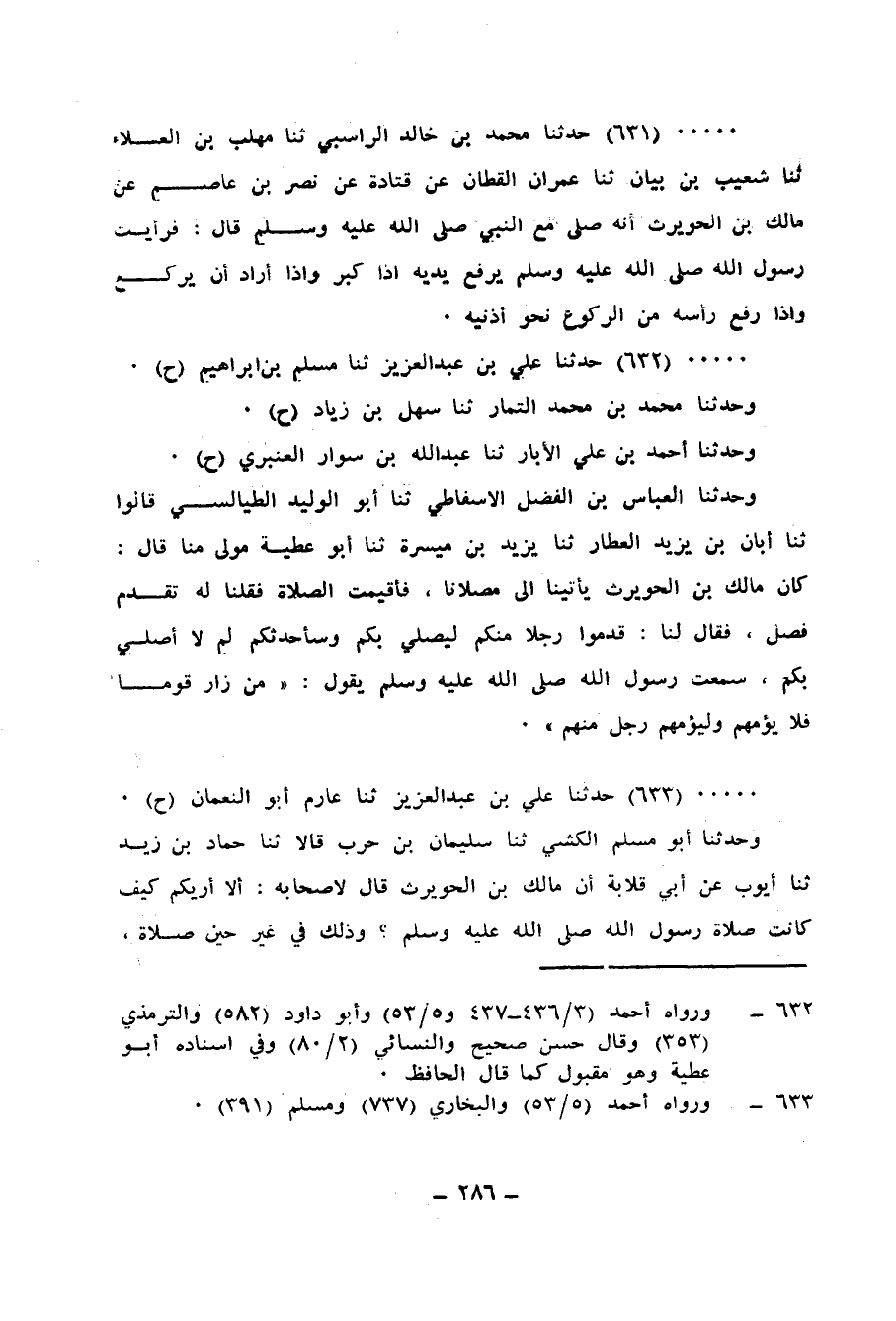 633 - حَدَّثَنَا عَلِيُّ بْنُ عَبْدِ الْعَزِيزِ، ثنا عَارِمٌ أَبُو النُّعْمَانِ، ح وَحَدَّثَنَا أَبُو مُسْلِمٍ الْكَشِّيِّ، ثنا سُلَيْمَانُ بْنُ حَرْبٍ، قَالَا: ثنا حَمَّادُ بْنُ زَيْدٍ، ثنا أَيُّوبُ، عَنْ أَبِي قِلَابَةَ، أَنَّ مَالِكَ بْنَ الْحُوَيْرِثِ، قَالَ لِأَصْحَابِهِ: «§أَلَا أُرِيَكُمْ كَيْفَ كَانَتْ صَلَاةُ رَسُولِ اللهِ صَلَّى اللهُ عَلَيْهِ وَسَلَّمَ؟» ، وَذَلِكَ فِي غَيْرِ حِينِ صَلَاةٍ، فَقَامَ، ثُمَّ رَكَعَ فَكَبَّرَ، ثُمَّ رَفَعَ رَأْسَهُ فَقَامَ هُنَيْهَةً، ثُمَّ سَجَدَ ثُمَّ رَفَعَ رَأْسَهُ، ثُمَّ انْتَظَرَ، ثُمَّ سَجَدَ، ثُمَّ رَفَعَ رَأْسَهُ، ثُمَّ انْتَظَرَ هُنَيْهَةً، ثُمَّ سَجَدَ، «وَاللَّفْظُ لِعَارِمٍ»