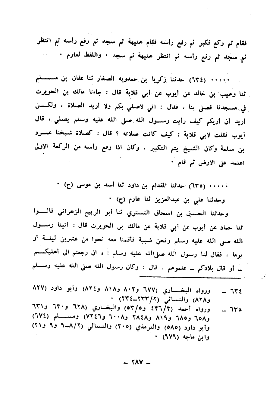 634 - حَدَّثَنَا زَكَرِيَّا بْنُ حَمْدَوَيْهِ الصَّفَّارُ، ثنا عَفَّانُ بْنُ مُسْلِمٍ، ثنا وُهَيْبُ بْنُ خَالِدٍ، عَنْ أَيُّوبَ، عَنْ أَبِي قِلَابَةَ، قَالَ: جَاءَنَا مَالِكُ بْنُ الْحُوَيْرِثِ فِي مَسْجِدِنَا فَصَلَّى بِنَا، فَقَالَ: " إِنِّي لِأُصَلِّي بِكُمْ وَلَا أُرِيدُ الصَّلَاةَ، وَلَكِنْ أُرِيدُ أَنْ أُرِيَكُمْ كَيْفَ رَأَيْتُ رَسُولَ اللهِ صَلَّى اللهُ عَلَيْهِ وَسَلَّمَ يُصَلِّي، قَالَ أَيُّوبُ: فَقُلْتُ لِأَبِي قِلَابَةَ: كَيْفَ كَانَتْ صَلَاتُهُ؟، قَالَ: كَصَلَاةِ شَيْخِنَا عَمْرِو بْنِ سَلَمَةَ، وَكَانَ الشَّيْخُ يُتِمُّ التَّكْبِيرَ، وَكَانَ §إِذَا رَفَعَ رَأْسَهُ مِنَ الرَّكْعَةِ الْأُولَى اعْتَمَدَ عَلَى الْأَرْضِ ثُمَّ قَامَ