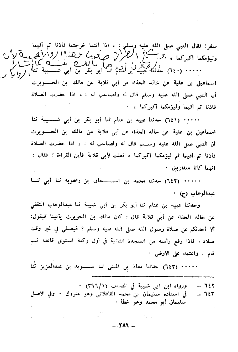642 - حَدَّثَنَا مُحَمَّدُ بْنُ إِسْحَاقَ بْنِ رَاهَوَيْهِ، ثنا أَبِي، ثنا عَبْدُ الْوَهَّابِ، ح وَحَدَّثَنَا عُبَيْدُ بْنُ غَنَّامٍ، ثنا أَبُو بَكْرِ بْنُ أَبِي شَيْبَةَ، ثنا عَبْدُ الْوَهَّابِ الثَّقَفِيُّ، عَنْ خَالِدٍ الْحَذَّاءِ، عَنْ أَبِي قِلَابَةَ قَالَ: كَانَ مَالِكُ بْنُ الْحُوَيْرِثِ يَأْتِينَا فَيَقُولُ: «§أَلَا أُحَدِّثُكُمْ عَنْ صَلَاةِ رَسُولِ اللهِ صَلَّى اللهُ عَلَيْهِ وَسَلَّمَ؟، فَيُصَلِّي فِي غَيْرِ وَقْتِ صَلَاةٍ، فَإِذَا رَفَعَ رَأْسَهُ مِنَ السَّجْدَةِ الثَّانِيَةِ فِي أَوَّلِ رَكْعَةٍ اسْتَوَى قَاعِدًا ثُمَّ قَامَ وَاعْتَمَدَ عَلَى الْأَرْضِ»