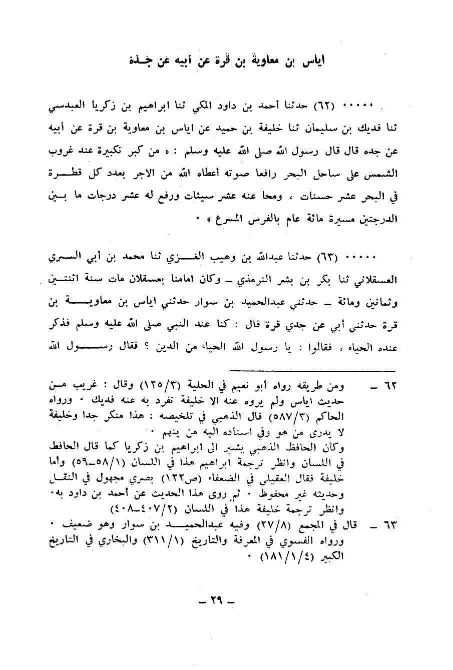 63 - حَدَّثَنَا عَبْدُ اللهِ بْنُ وُهَيْبٍ الْغَزِّيُّ، ثنا مُحَمَّدُ بْنُ أَبِي السَّرِيُّ الْعَسْقَلَانِيُّ، ثنا بَكْرُ بْنُ بِشْرٍ التِّرْمِذِيُّ، وَكَانَ إِمَامَنَا بِعَسْقَلَانَ مَاتَ سَنَةَ اثْنَتَيْنِ وَثَمَانِينَ وَمِائَةٍ، حَدَّثَنِي عَبْدُ الْحَمِيدِ بْنُ سَوَّارٍ، حَدَّثَنِي إِيَاسُ بْنُ مُعَاوِيَةَ بْنِ قُرَّةَ، حَدَّثَنِي أَبِي، عَنْ جَدِّي قُرَّةَ، قَالَ: كُنَّا عِنْدَ النَّبِيِّ صَلَّى اللهُ عَلَيْهِ وَسَلَّمَ فَذُكِرَ عِنْدَهُ الْحَيَاءُ، فَقَالُوا: يَا رَسُولَ اللهِ §الْحَيَاءُ مِنَ الدِّينِ؟، فَقَالَ رَسُولُ اللهِ صَلَّى اللهُ عَلَيْهِ وَسَلَّمَ: «بَلْ هُوَ الدِّينُ كُلُّهُ»