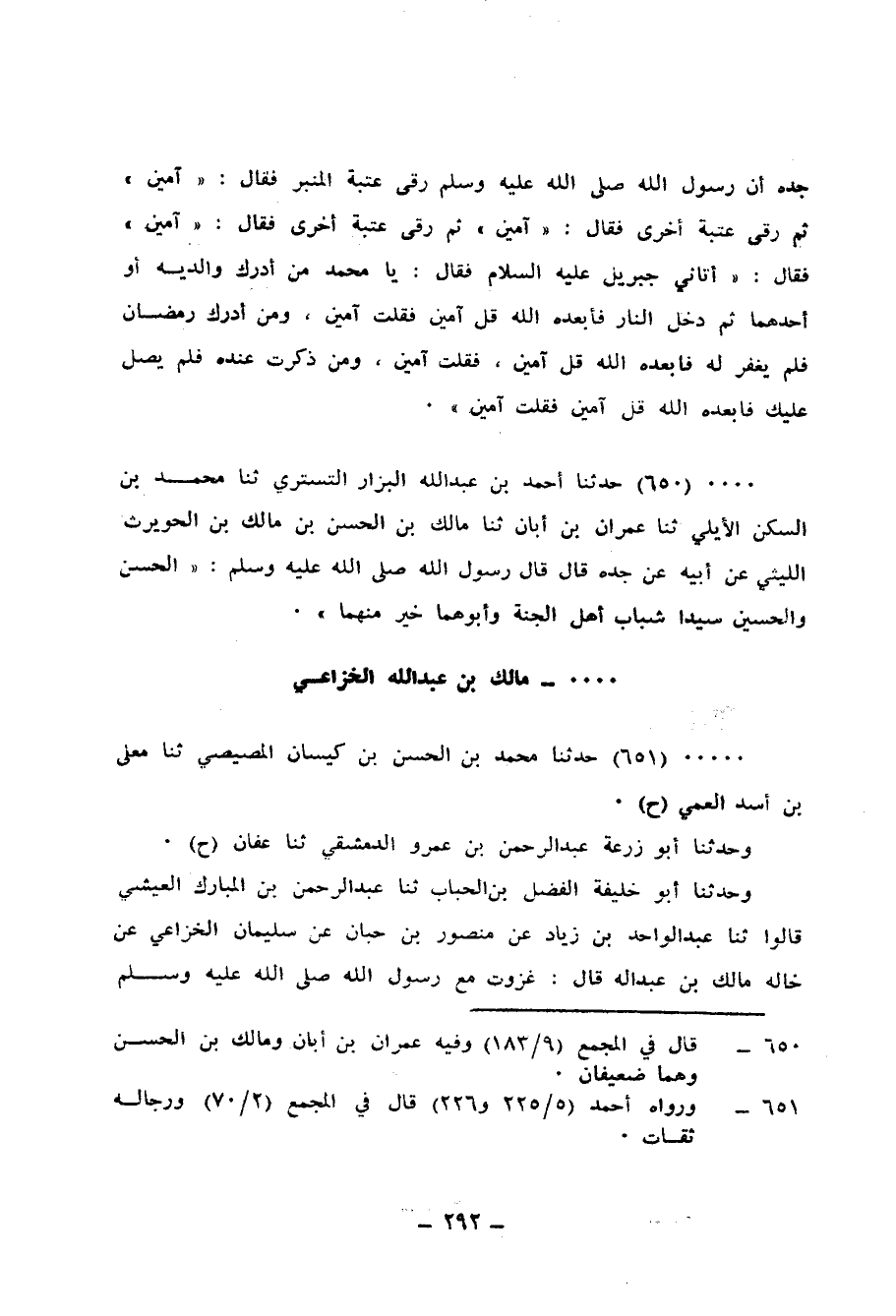 651 - حَدَّثَنَا مُحَمَّدُ بْنُ الْحَسَنِ بْنِ كَيْسَانَ الْمِصِّيصِيُّ، ثنا مُعَلَّى بْنُ أَسَدٍ الْعَمِّيُّ، ح وَحَدَّثَنَا أَبُو زُرْعَةَ عَبْدُ الرَّحْمَنِ بْنُ عَمْرٍو الدِّمَشْقِيُّ، ثنا عَفَّانُ، ح وَحَدَّثَنَا أَبُو خَلِيفَةَ الْفَضْلُ بْنُ الْحُبَابِ، ثنا عَبْدُ الرَّحْمَنِ بْنُ الْمُبَارَكِ الْعَيْشِيُّ، قَالُوا: ثنا عَبْدُ الْوَاحِدِ بْنُ زِيَادٍ، عَنْ مَنْصُورِ بْنِ حَبَّانَ، عَنْ سُلَيْمَانَ الْخُزَاعِيِّ، عَنْ خَالِهِ مَالِكِ بْنِ عَبْدِ اللهِ، قَالَ: «§غَزَوْتُ مَعَ رَسُولِ اللهِ صَلَّى اللهُ عَلَيْهِ وَسَلَّمَ، فَمَا صَلَّيْتُ خَلْفَ إِمَامِ قَوْمٍ أَخَفَّ صَلَاةٍ مِنْ رَسُولِ اللهِ صَلَّى اللهُ عَلَيْهِ وَسَلَّمَ»