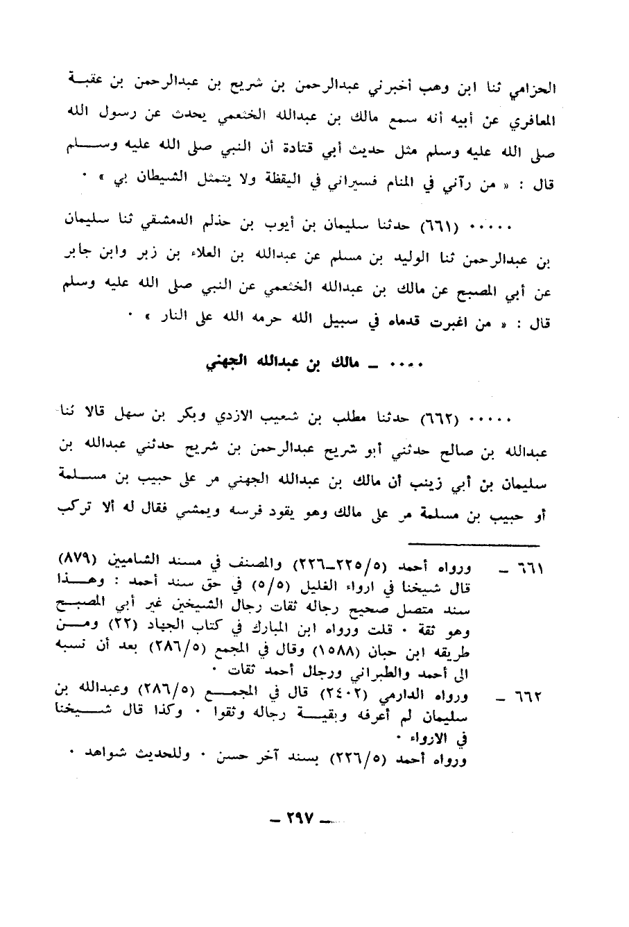 662 - حَدَّثَنَا مُطَّلِبُ بْنُ شُعَيْبٍ الْأَزْدِيُّ، وَبَكْرُ بْنُ سَهْلٍ، قَالَا: ثنا عَبْدُ اللهِ بْنُ صَالِحٍ، حَدَّثَنِي أَبُو شُرَيْحٍ عَبْدُ الرَّحْمَنِ بْنُ شُرَيْحٍ، حَدَّثَنِي عَبْدُ اللهِ بْنُ سُلَيْمَانَ بْنِ أَبِي زَيْنَبَ، أَنَّ مَالِكَ بْنَ عَبْدِ اللهِ الْجُهَنِيَّ، مَرَّ عَلَى حَبِيبِ بْنِ مَسْلَمَةَ، أَوْ حَبِيبَ بْنَ مَسْلَمَةَ مَرَّ عَلَى مَالِكٍ، وَهُوَ يَقُودُ فَرَسَهُ وَيَمْشِي فَقَالَ لَهُ: أَلَا تَرْكَبُ إِذْ حَمَلَكَ اللهُ؟، فَقَالَ: إِنَّ رَسُولَ اللهِ صَلَّى اللهُ عَلَيْهِ وَسَلَّمَ قَالَ: «§مَنِ اغْبَرَّتْ قَدَمَاهُ فِي سَبِيلِ اللهِ حَرَّمَهُ اللهُ عَلَى النَّارِ»