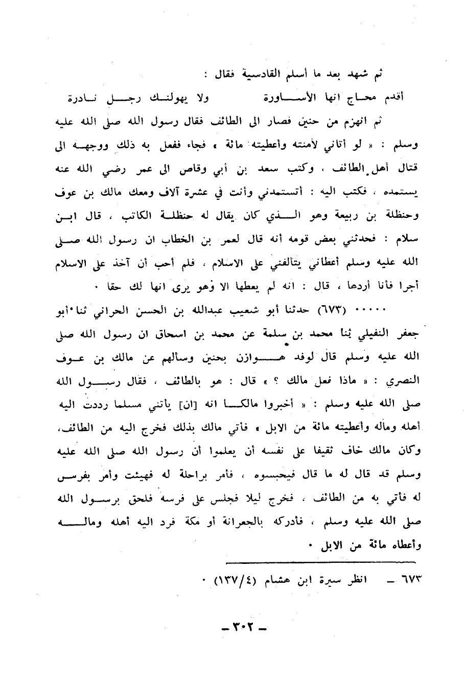 673 - حَدَّثَنَا أَبُو شُعَيْبٍ عَبْدُ اللهِ بْنُ الْحَسَنِ الْحَرَّانِيُّ، ثنا أَبُو جَعْفَرٍ النُّفَيْلِيُّ، ثنا مُحَمَّدُ بْنُ سَلَمَةَ، عَنْ مُحَمَّدِ بْنِ إِسْحَاقَ، أَنَّ رَسُولَ اللهِ صَلَّى اللهُ عَلَيْهِ وَسَلَّمَ قَالَ لِوَفْدِ هَوَازِنَ، بِحُنَيْنٍ، وَسَأَلَهُمْ عَنْ مَالِكِ بْنِ عَوْفٍ النَّصْرِيِّ: «مَاذَا فَعَلَ مَالِكٌ؟» ، قَالَ: هُوَ بِالطَّائِفِ، فَقَالَ رَسُولُ اللهِ صَلَّى اللهُ عَلَيْهِ وَسَلَّمَ: «أَخْبِرُوا مَالِكًا أَنَّهُ §إِنْ يَأْتِنِي مُسْلِمًا رَدَدْتُ إِلَيْهِ أَهْلَهُ وَمَالَهُ وَأَعْطَيْتُهُ مِائَةً مِنَ الْإِبِلِ» ، فَأَتَى مَالِكٌ بِذَلِكَ فَخَرَجَ إِلَيْهِ مِنَ الطَّائِفِ، وَكَانَ مَالِكٌ خَافَ ثَقِيفًا عَلَى نَفْسِهِ أَنْ يَعْلَمُوا أَنَّ رَسُولَ اللهِ صَلَّى اللهُ عَلَيْهِ وَسَلَّمَ قَدْ قَالَ لَهُ مَا قَالَ فَيَحْبِسُوهُ، فَأَمَرَ بِرَاحِلَةٍ لَهُ فَهُيِّئَتْ، وَأَمَرَ بِفَرَسٍ لَهُ فَأُتِيَ بِهِ مِنَ الطَّائِفِ، فَخَرَجَ لَيْلًا فَجَلَسَ عَلَى فَرَسِهِ فَلَحِقَ بِرَسُولِ اللهِ صَلَّى اللهُ عَلَيْهِ وَسَلَّمَ، فَأَدْرَكَهُ بِالْجِعْرَانَةِ أَوْ مَكَّةَ، فَرَدَّ إِلَيْهِ أَهْلَهُ وَمَالَهُ وَأَعْطَاهُ مِائَةً مِنَ الْإِبِلِ